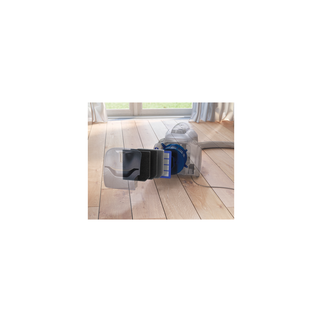 Sistemul de filtrare in 7 trepte permite filtrarea avansata a micro particulelor de praf si garanteaza eliberarea exclusiva de aer curat inapoi in locuinta.