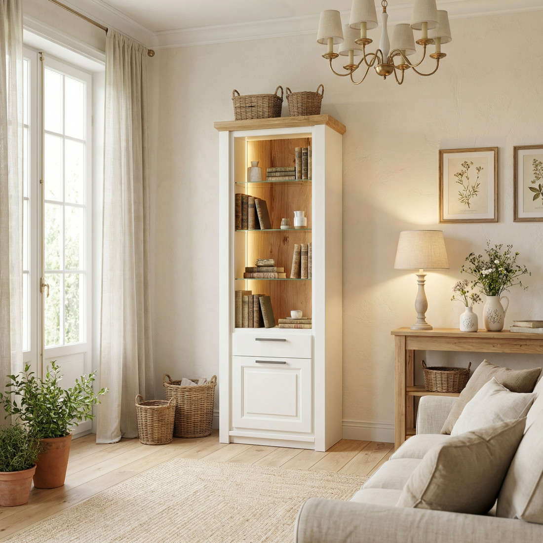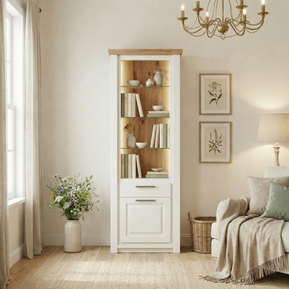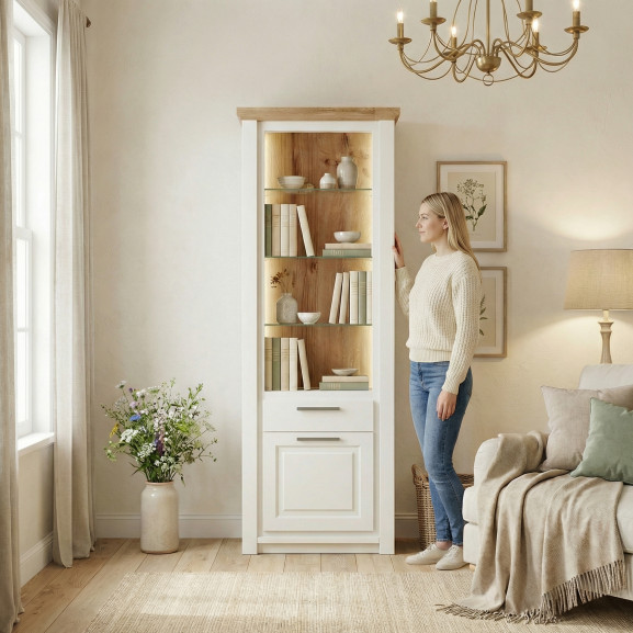 Adu un aer nobil și luminos în livingul sau biroul tău cu Biblioteca Thuxon pe alb. Această piesă de mobilier rafinată combină puritatea albului cu căldura inconfundabilă a lemnului, fiind ideală pentru interioarele care caută echilibrul între stilul clasic și cel modern.