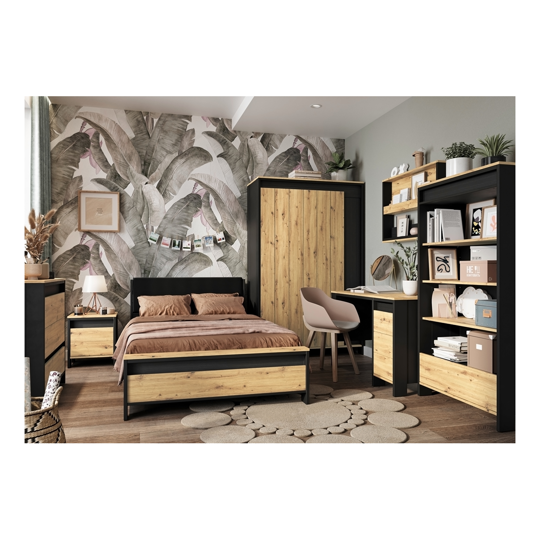 Fronturi spațioase, picioare zvelte și decoruri la modă în lemn negru și Stejar Artizanal- aceasta este o rețetă pentru o cameră de tineret în stil industrial. Și apoi există iluminarea cu led care calmează sau energizează, în funcție de ceea ce aveți nevoie.