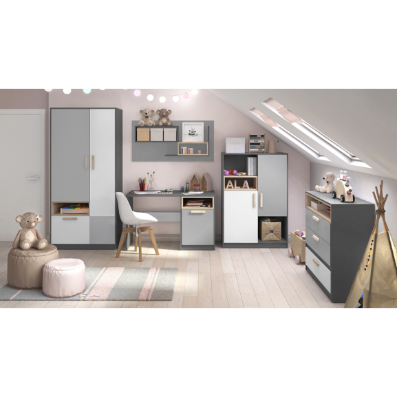 O bibliotecă foarte originală, care vă permite să aranjați convenabil o varietate de lucruri. Are un spațiu de depozitare încuiat pentru haine și alte articole pe care nu-ți place să le ții deasupra. Rafturile din grafit sunt un loc bun pentru cărți, inclusiv atlasuri înalte și alte accesorii școlare. Într-o nișă joasă, accentuată cu un decor de culoarea lemnului, puteți plasa obiecte și decorațiuni mai mici. Combinația de trei culori - gri deschis, grafit și alb arată modernă și, în același timp, este foarte universală și oferă o aranjare ușoară în orice interior. Detaliile de culoarea lemnului adaugă confort și energie bună. Mobilierul este realizat dintr-o placă laminată durabilă, finisată cu o margine durabilă din ABS. Mânere din lemn de fag.