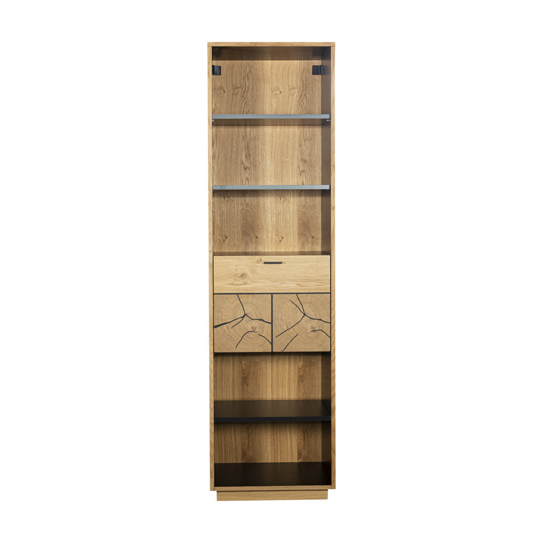 Culorile calde ale stejarului rustic se îmbină armonios cu nuanțele moderne de negru, creând un design distinctiv și versatil. Realizată din materiale de cea mai înaltă calitate, inclusiv pal furniruit și elemente de decor din lemn masiv furniruit, această bibliotecă impresionează nu doar prin estetică, ci și prin durabilitate și rezistență în timp.