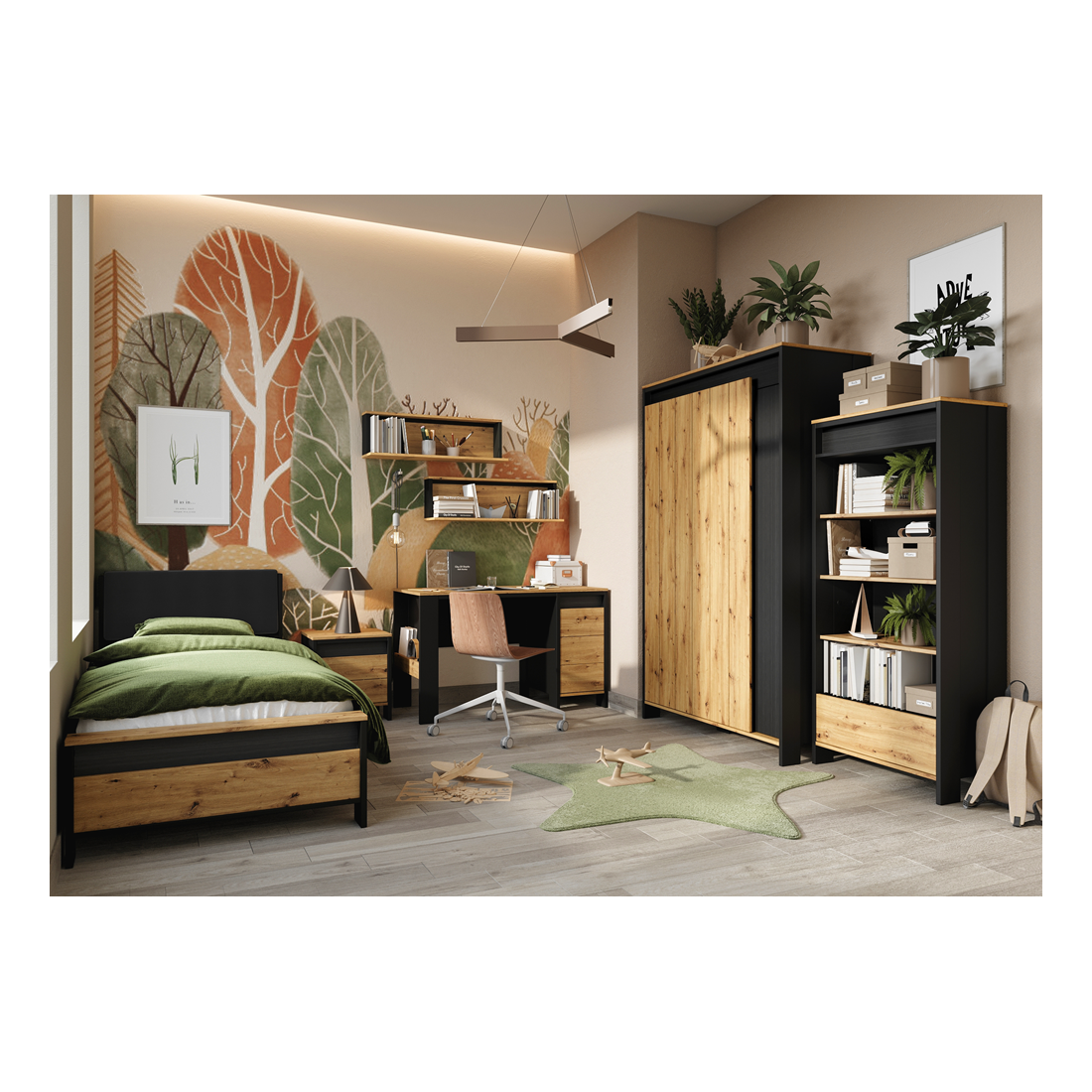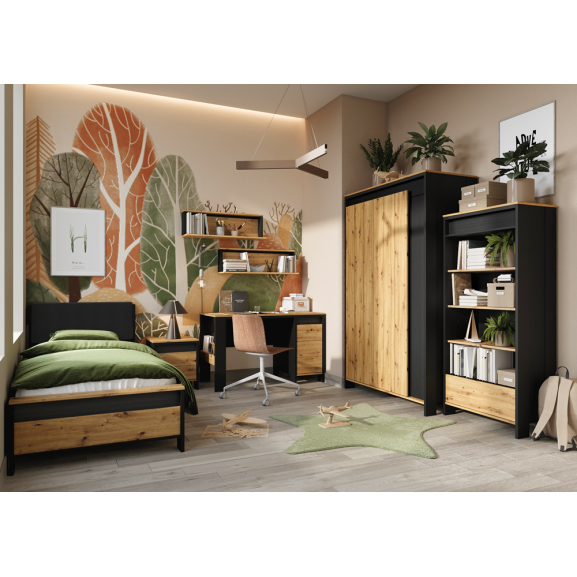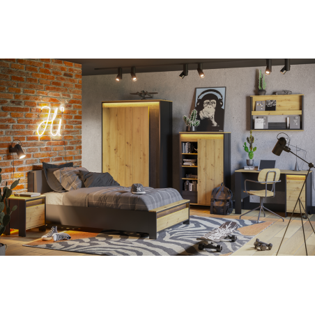 Fronturi spațioase, picioare zvelte și decoruri la modă în lemn negru și Stejar Artizanal- aceasta este o rețetă pentru o cameră de tineret în stil industrial. Și apoi există iluminarea cu led care calmează sau energizează, în funcție de ceea ce aveți nevoie.