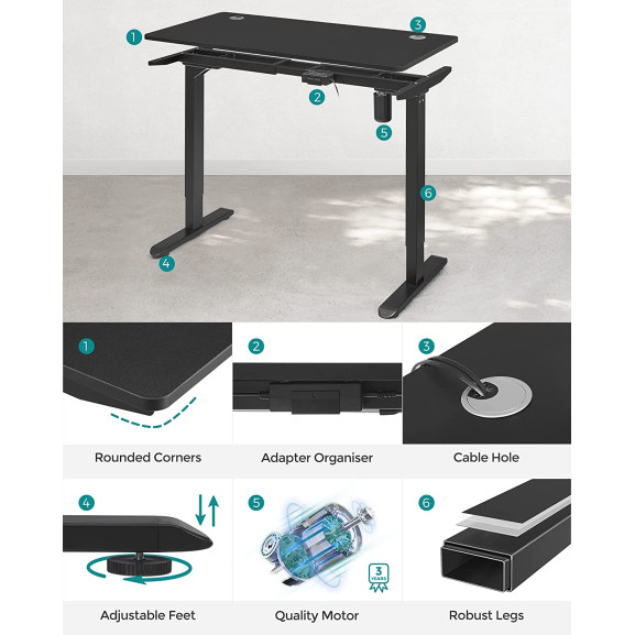 Cadrul de masă electrică este reglabil în lungime între 110 și 155 cm, ceea ce permite o ajustare flexibilă la un blat de masă mai mare (lungime: 120 cm-180 cm, lățime: 60 - 80 cm)