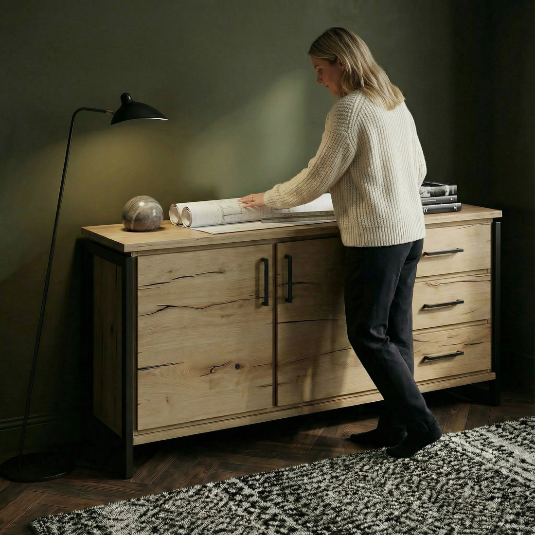 Fabricat din plăci aglomerate de lemn și furnir de foioase, bufetul oferă o durabilitate de încredere. Calitatea și atenția la detalii fac din aceasta o piesă de mobilier care va rezista testului timpului.