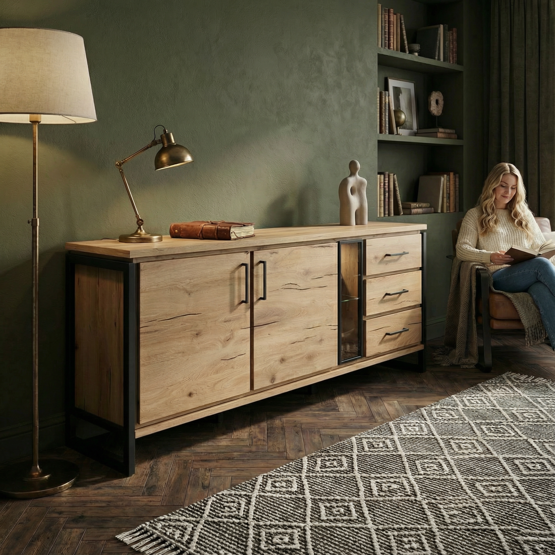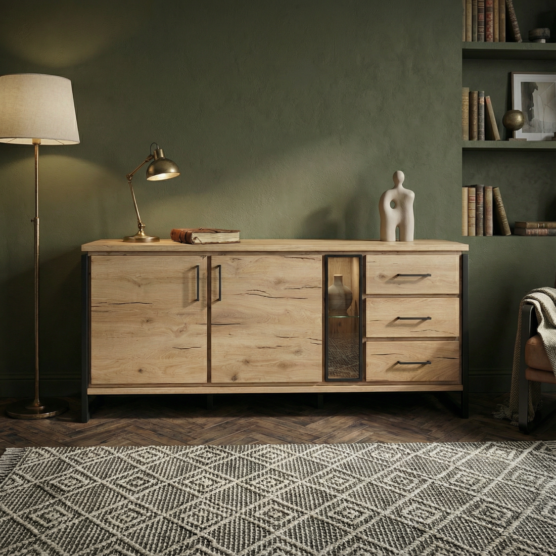 Bufetul cu 2 uși și 3 sertare Reno, într-o combinație elegantă de Smoked Oak și Negru, reprezintă un exemplu de mobilier de înaltă calitate care îmbină utilitatea și estetica. Realizat din furnir de lemn masiv, acest bufet emană durabilitate și eleganță în fiecare detaliu.