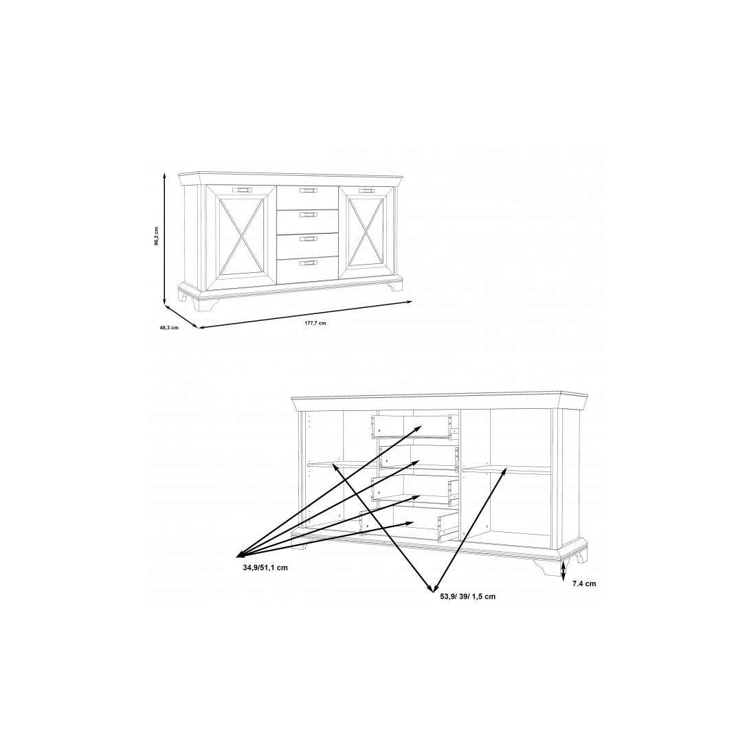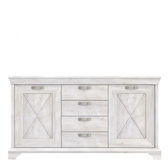 Cele 2 uși și cele 4 sertare ale bufetului Kashmir oferă spațiu generos pentru a-ți păstra obiectele personale organizate și la îndemână. Este locul ideal pentru veselă, lenjerie, sau orice alte lucruri pe care dorești să le păstrezi în siguranță.