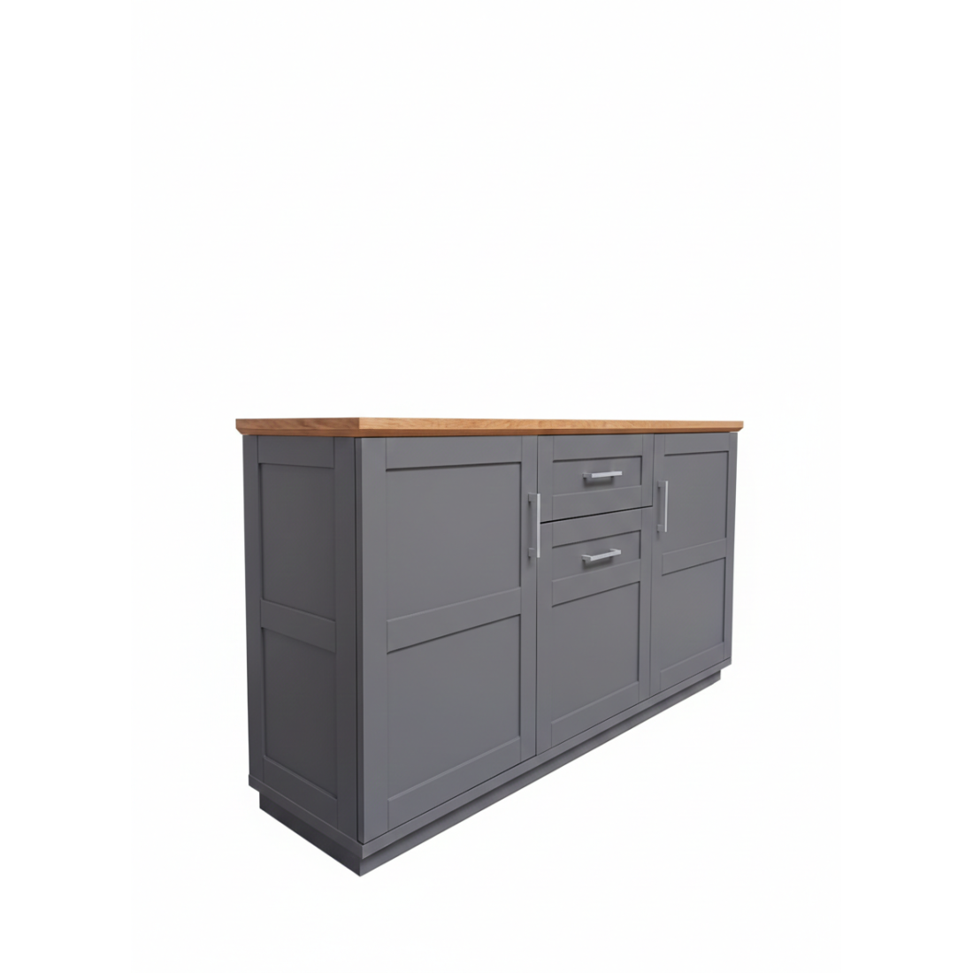 Completează decorul casei tale cu acest bufet elegant și extrem de practic, o piesă de mobilier care impresionează prin simplitate și calitate. Finisajul Gri vopsit aduce luminozitate și un aer curat încăperii, în timp ce blatul superior, acoperit cu furnir de stejar natural, adaugă acea notă caldă și nobilă pe care doar lemnul o poate oferi.