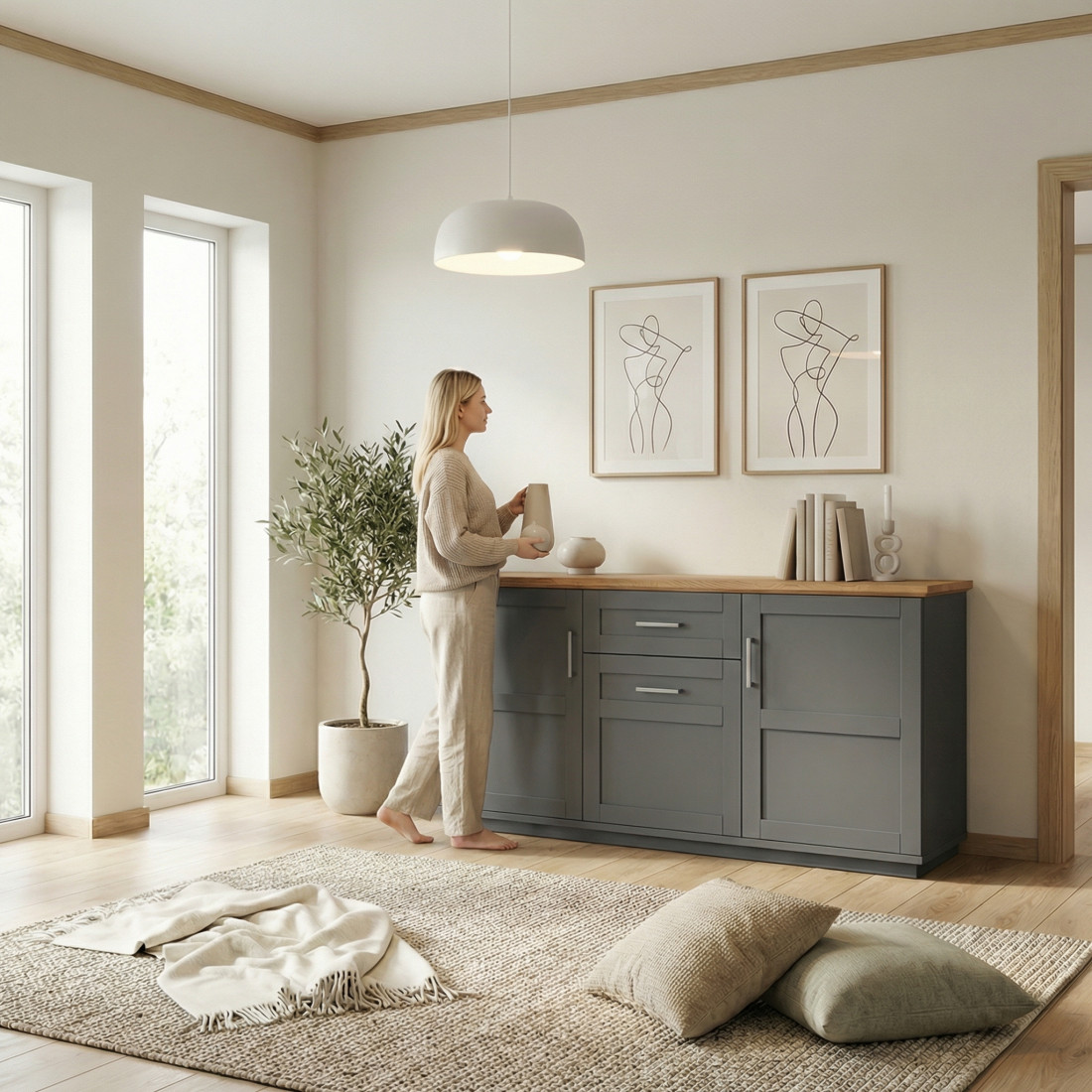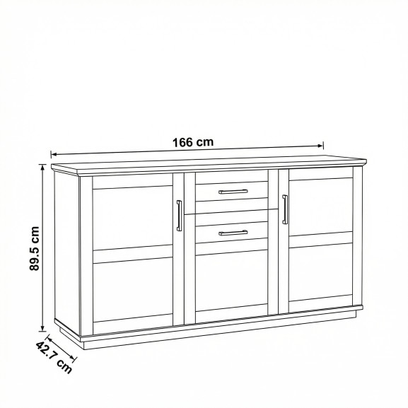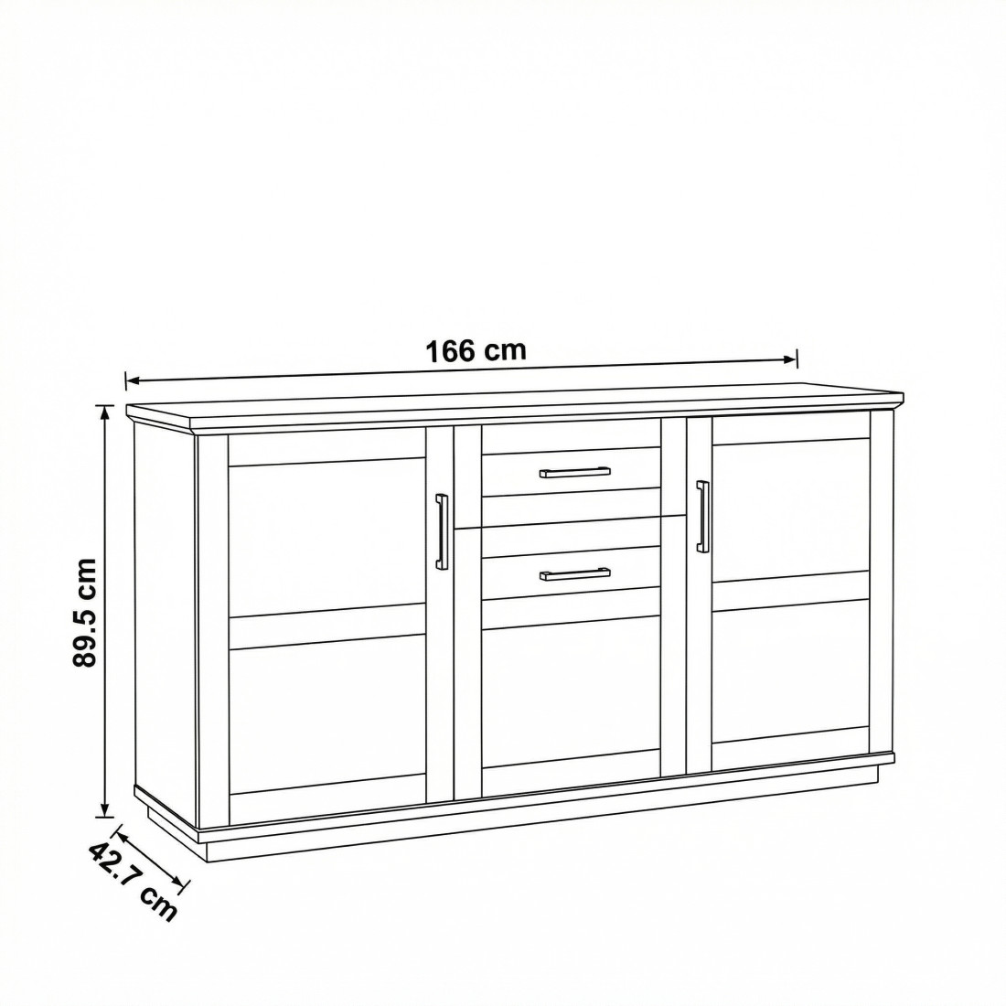 Designul inteligent cu 3 uși și 1 sertar este gândit pentru a maximiza spațiul de depozitare. Sertarul este ideal pentru organizarea tacâmurilor sau a documentelor, iar compartimentele generoase din spatele celor trei uși îți permit să depozitezi veselă, textile sau alte obiecte voluminoase, păstrând livingul perfect ordonat. Mânerele metalice completează designul cu un accent modern și discret.