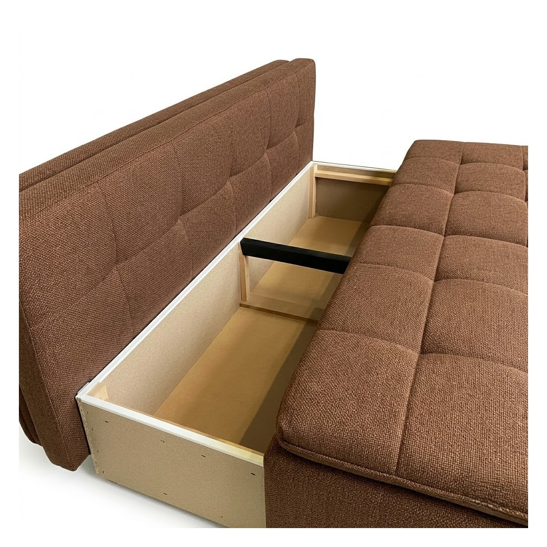 Ladă de Depozitare Integrată: Dotată cu un compartiment generos sub șezut, canapeaua vă ajută să mențineți ordinea în casă, fiind locul perfect pentru depozitarea lenjeriei, a pernelor sau a cuverturilor.