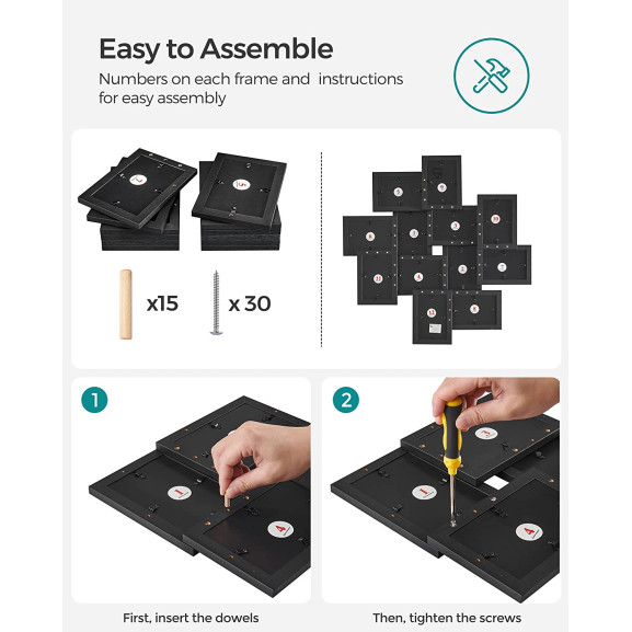 Veți avea acest colaj de rame foto asamblat și umplut cu fotografiile dumneavoastra preferate în cel mai scurt timp după ce urmați instrucțiunile detaliate; atunci când doriți să schimbați pozele, tableta rotativă de pe spate o face rapidă și convenabilă.