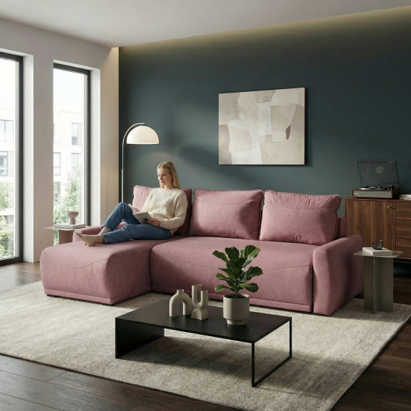 Coltar Extensibil Lea Interschimbabil Stanga/Dreapta, 5 Locuri, Lada Depozitare, Roz, 256 Cm
