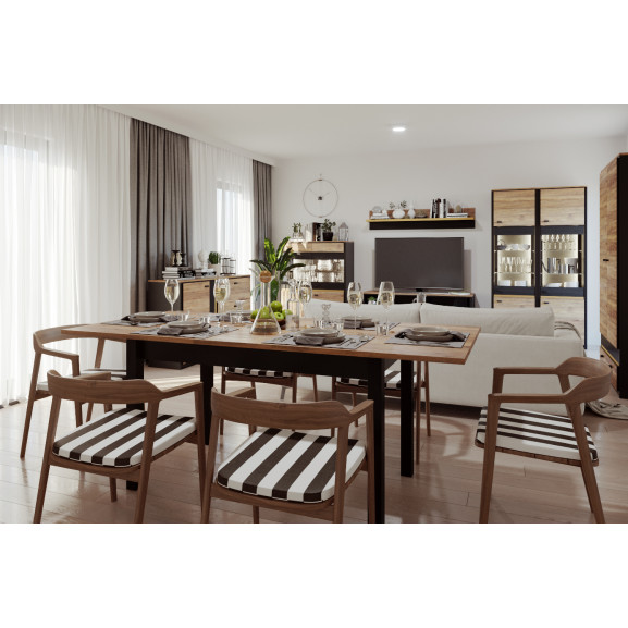 Mobilierul se remarcă prin design modern și un caracter eficient. Corpul negru arată grozav în compania unei culori elegante a lemnului și a unei benzi aurii periate. Este o propunere ideală pentru toți iubitorii stilului economic glamour.