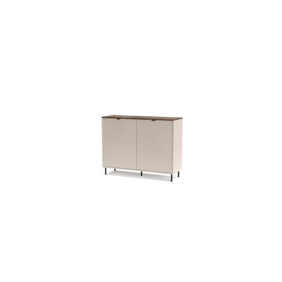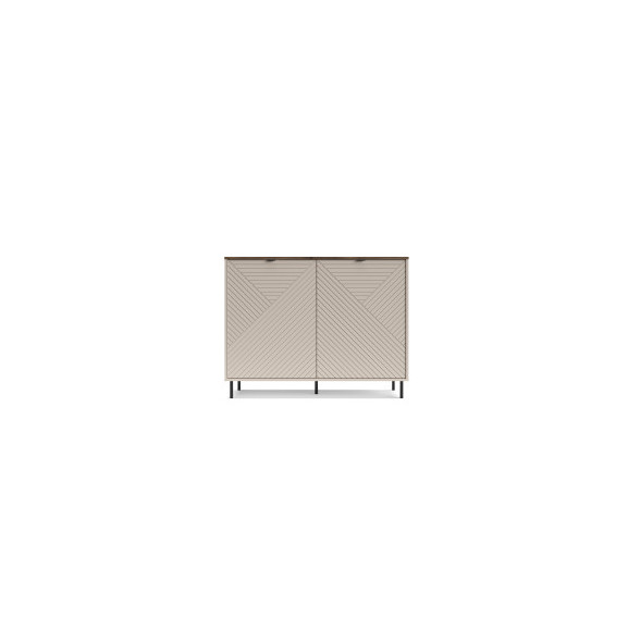Descriere: Transformă-ți livingul într-o galerie de artă modernă cu Comoda Miracle (Mirage). Această piesă nu este doar un spațiu de depozitare, ci un element de decor central, definit de jocul fascinant al liniilor. Fronturile finisate în nuanța caldă Cashmere (bej mat) sunt decorate cu un model geometric frezat (linii diagonale tip "Chevron"), care creează un efect vizual de adâncime și mișcare.