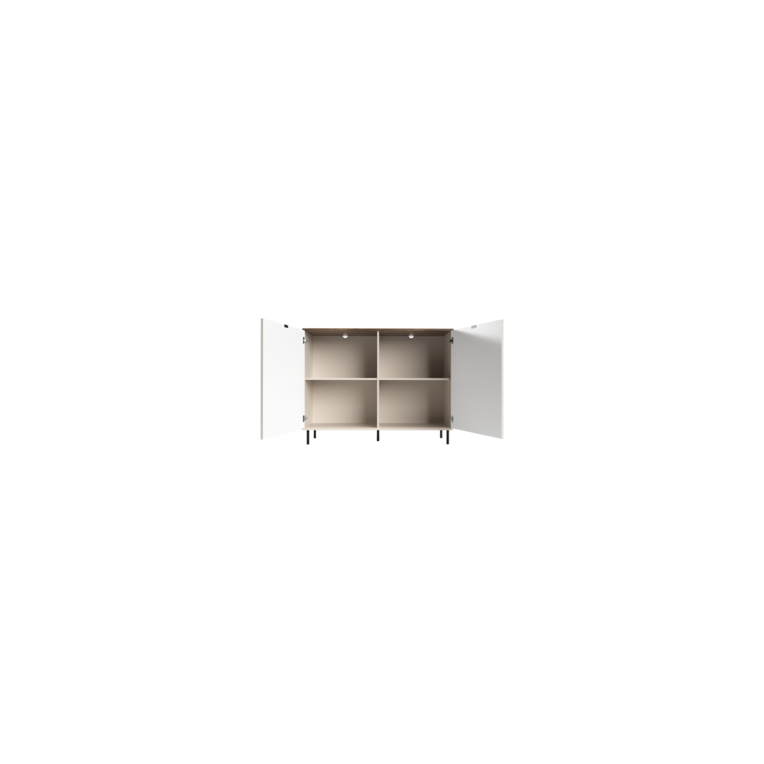 Eleganța este completată de contrastul rafinat dintre corpul luminos și blatul superior în nuanță de lemn închis (nuc/stejar), oferind un loc perfect pentru obiecte decorative sau o veioză de design. Structura este susținută de picioare metalice negre, înalte și subțiri, care conferă lejeritate vizuală. În interior, cele două uși ascund 4 compartimente spațioase, ideale pentru a organiza vesela, cărțile sau documentele, menținând ordinea perfectă în casă.
