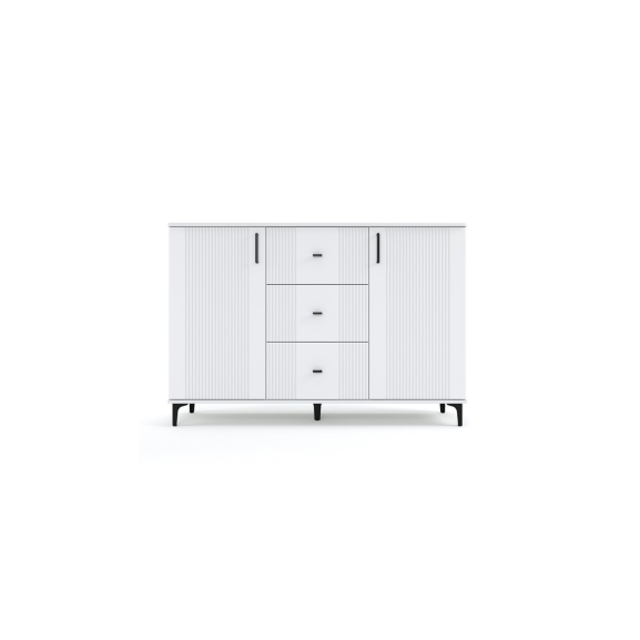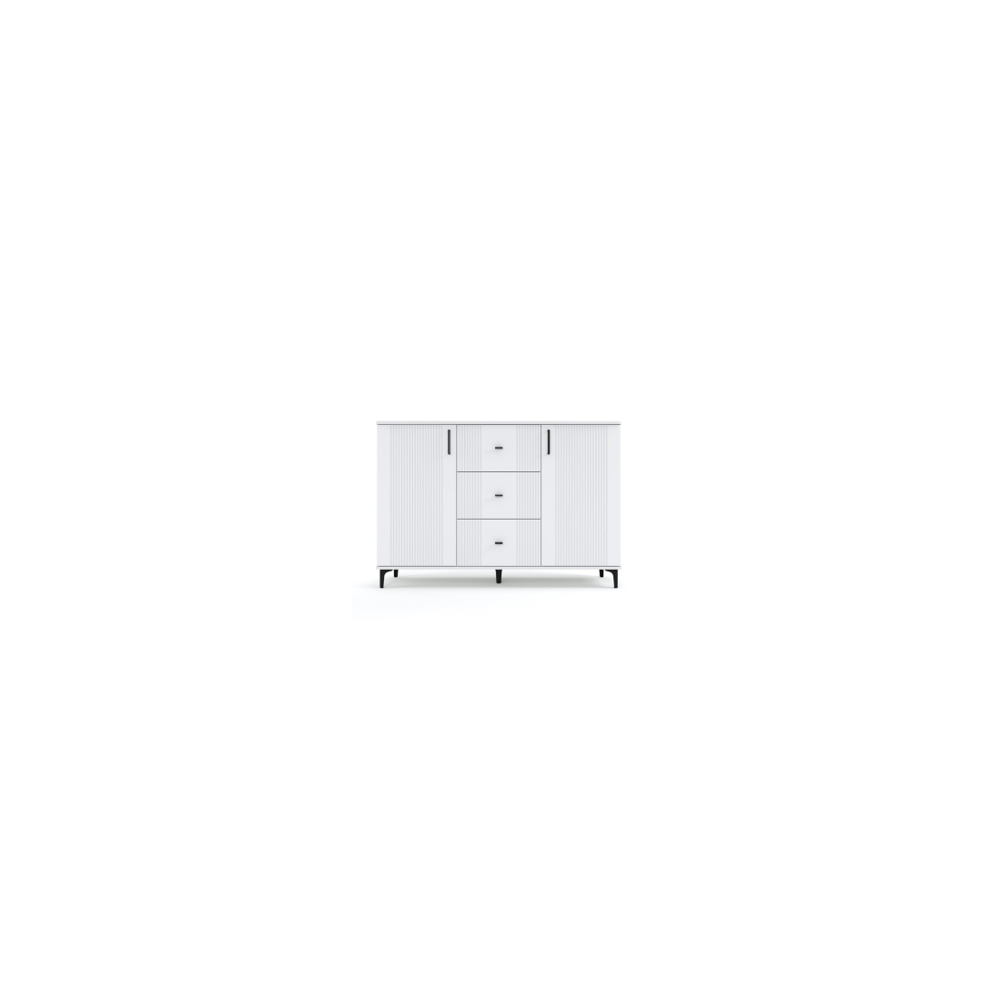 Contrastul este cheia eleganței sale: corpul imaculat din MDF Vopsit Alb este pus în valoare de accesoriile moderne – mânerele metalice negre (verticale pe uși, orizontale pe sertare) și picioarele înalte, suple, tot în finisaj negru. Aceste picioare nu doar că arată excelent, dar facilitează și curățenia dedesubtul comodei.