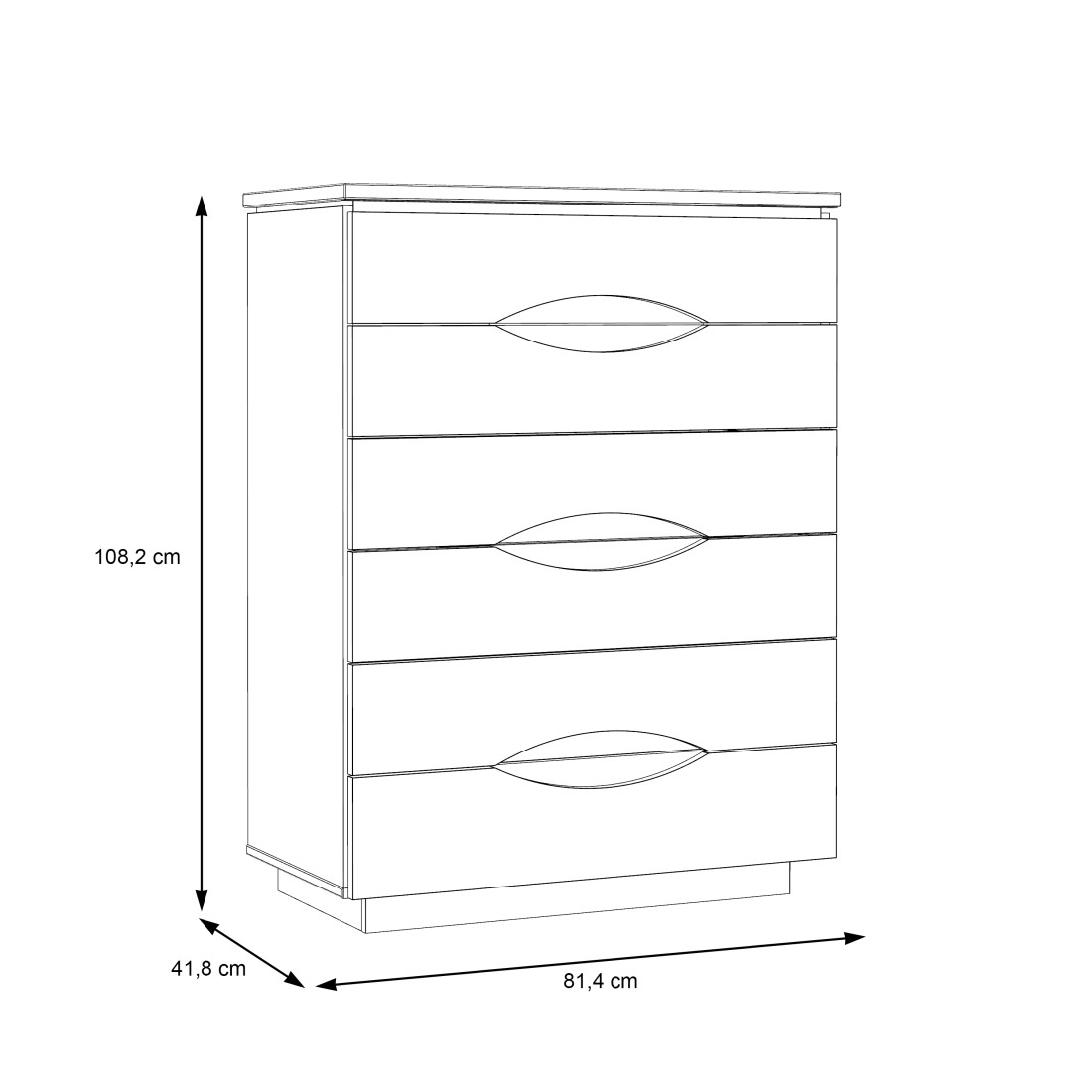 Designul se bazează pe armonia dintre finisajul natural Riviera Oak și profunzimea nuanței Uni Wolfram Grey. Elementul central de stil este reprezentat de cele trei decupaje sub formă de migdală, care nu doar că fragmentează vizual fațada, dar ascund și sistemul de deschidere ergonomic pentru cele 6 sertare. La fel ca restul colecției, comoda dispune de o bandă LED integrată sub blat, creând o atmosferă caldă și sofisticată în camera de zi sau dormitor.