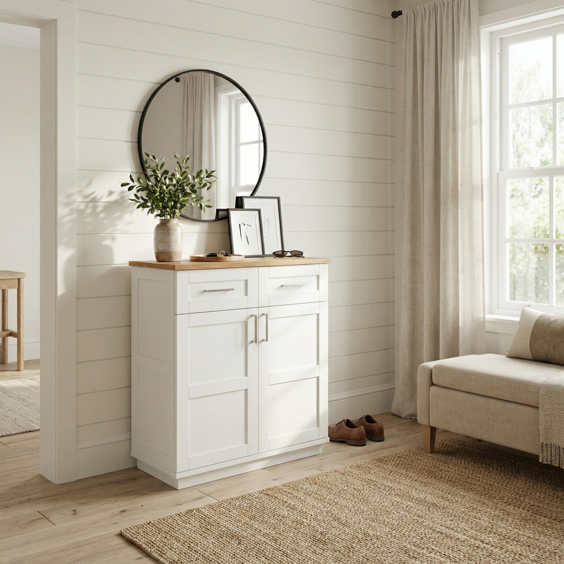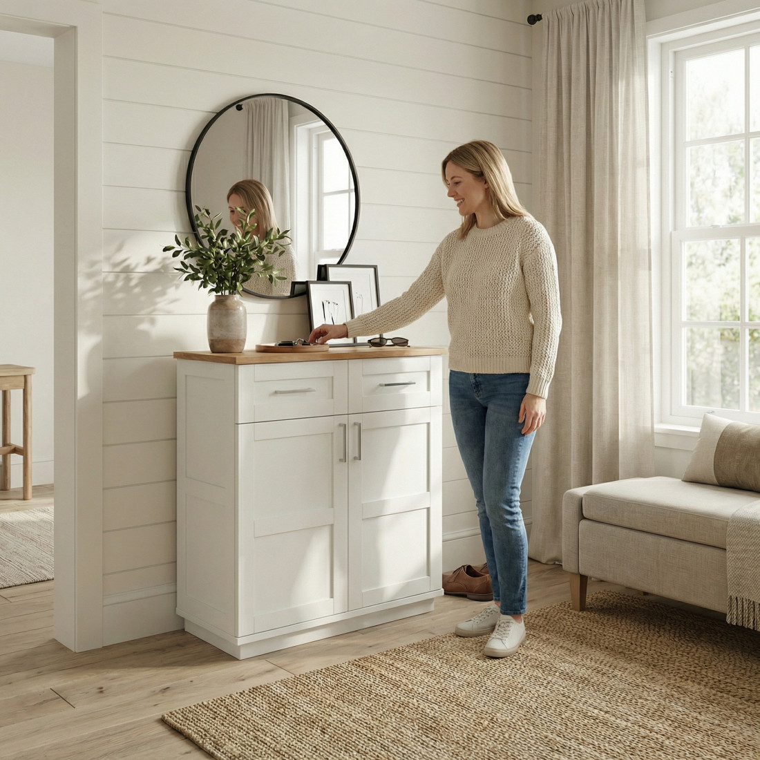 Cele 2 sertare superioare sunt perfecte pentru a păstra la îndemână, dar ascunse, obiectele mici: chei, portofele, perii de haine sau crema de pantofi.