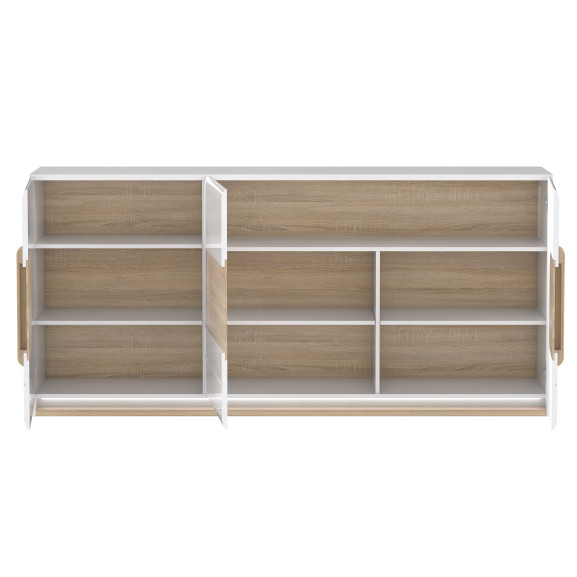 Comoda impresionează cu linii curate și o combinație armonioasă de culori. Finisajul din stejar Sonoma și detalii alb lucios conferă un aspect sofisticat și contemporan.