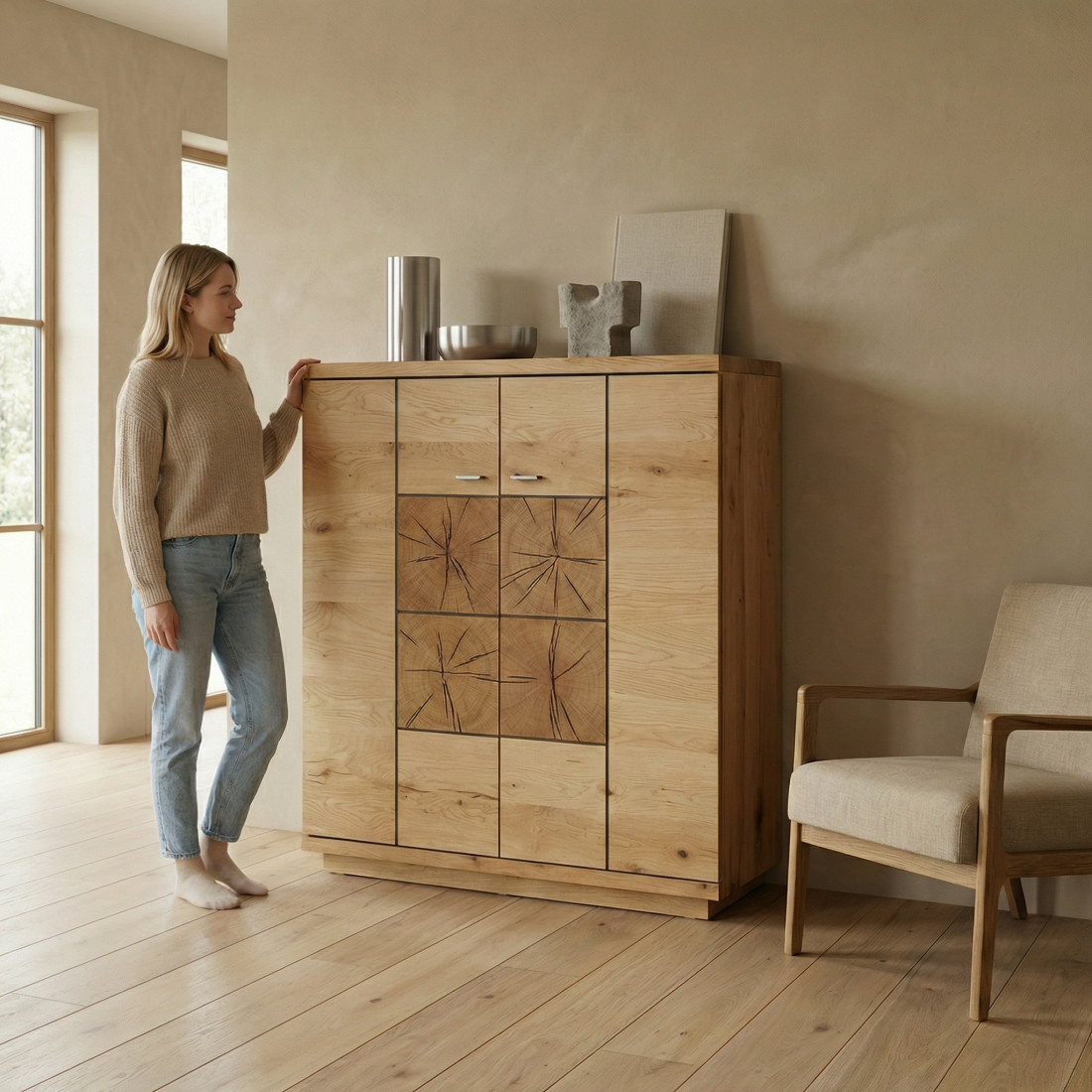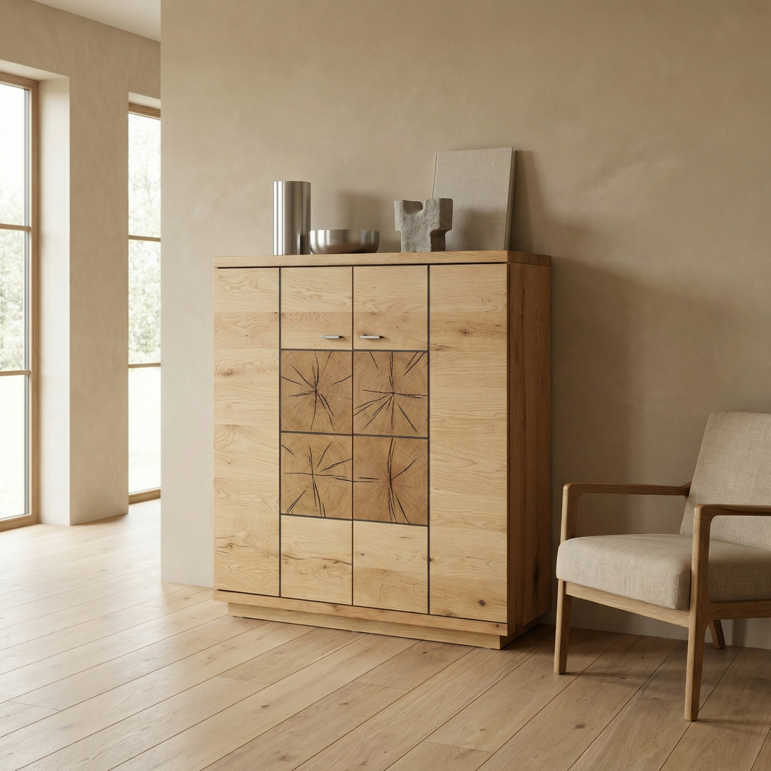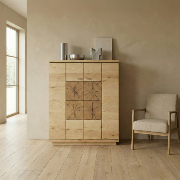 Carcasa din PAL și MDF infoliat cu furnir din lemn masiv de înaltă calitate garantează durabilitate și un aspect estetic deosebit. Fiecare detaliu este atent ponderat, iar sistemul de închidere silențioasă adaugă un plus de confort și lux la utilizare.