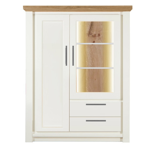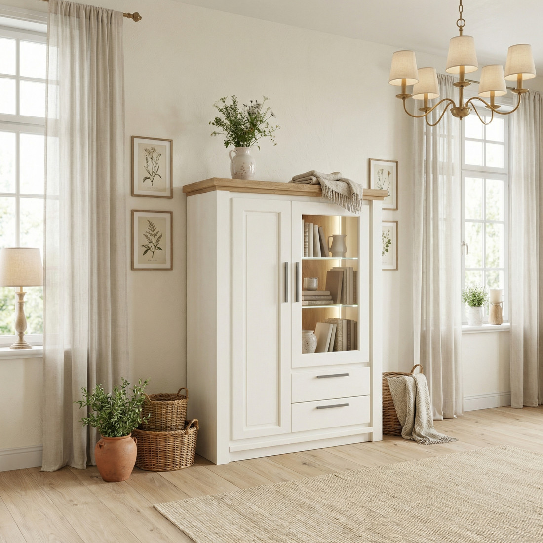 Organizare Practică: Sub vitrină se află 2 sertare spațioase pentru accesorii (tirbușoane, șervete, suporturi), iar în partea stângă, ușa înaltă casetată (cu tăblie) ascunde rafturi generoase pentru stocarea discretă a obiectelor voluminoase.