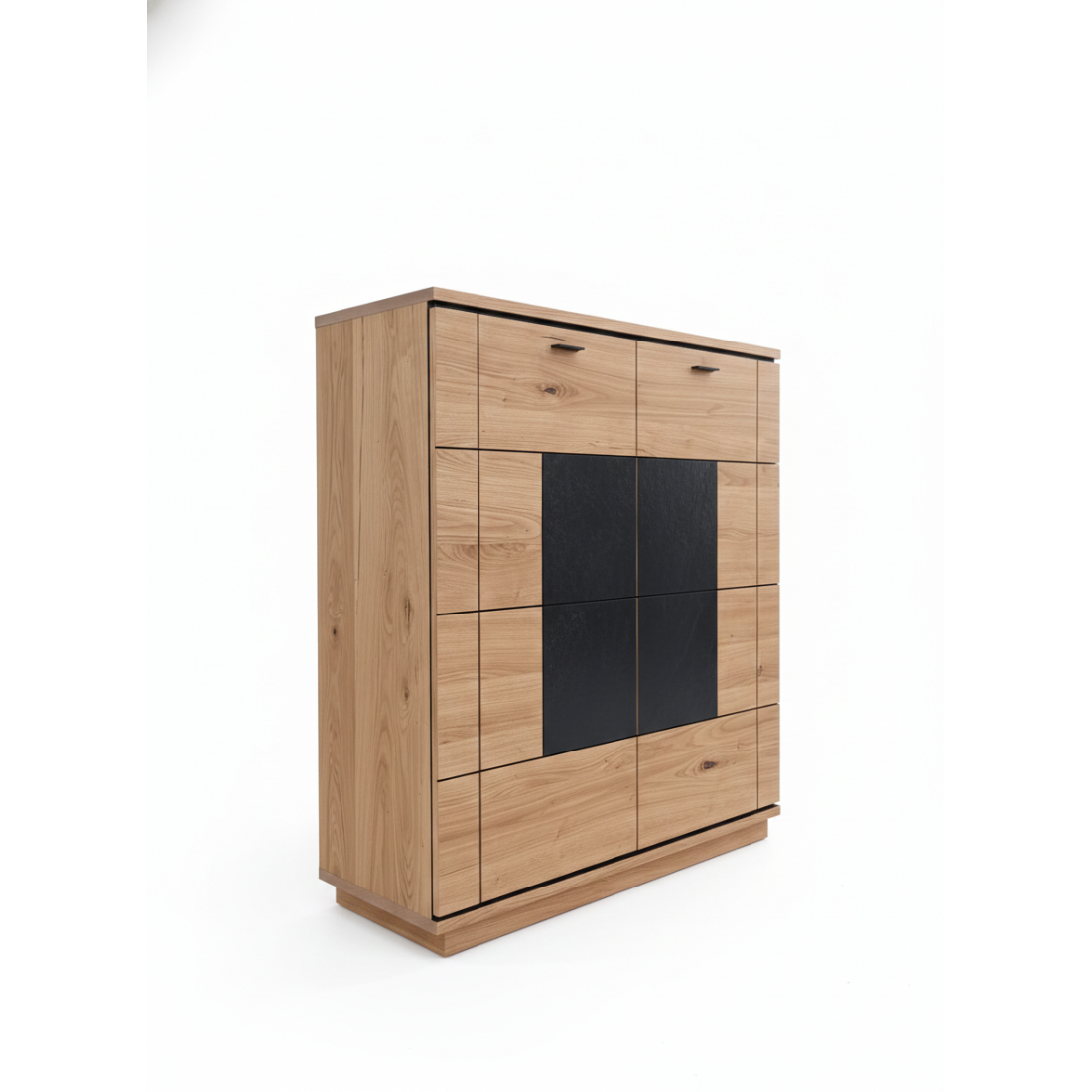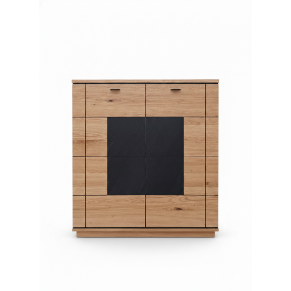Designul este o celebrare a contrastelor: căldura furnirului natural de stejar este întreruptă elegant de o inserție centrală cu textură de granit, care conferă un aer modern și sofisticat. Liniile negre decorative completează acest look industrial-chic.