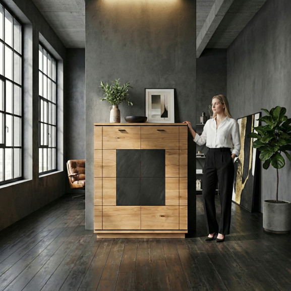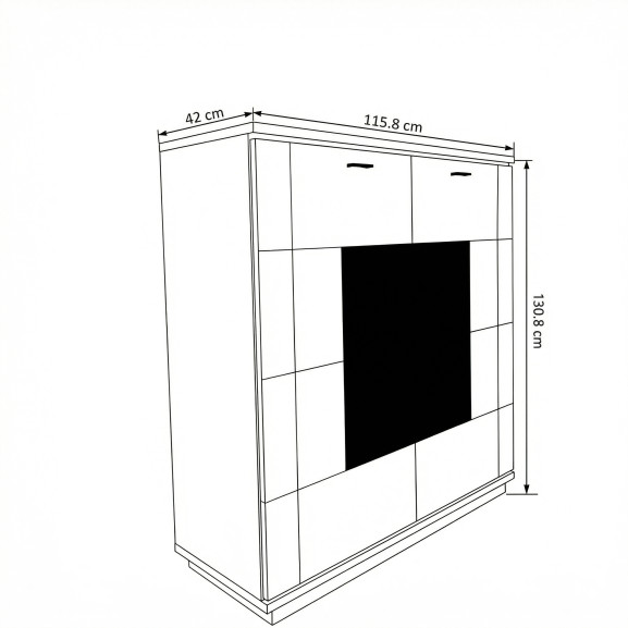 Redefinește zona de dining sau livingul cu Comoda Bar Zenith, o piesă de mobilier care impune respect prin statură și rafinament. Cu o înălțime de 130.8 cm, acest bufet tip "Highboard" este ideal pentru organizarea zonei de bar, oferind un spațiu generos de depozitare pe verticală, fără a ocupa mult loc la sol.