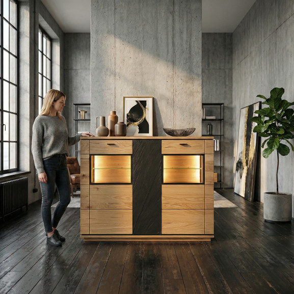 O comodă tip bar spațioasă și robustă din colecția Zenith, care combină funcționalitatea avansată cu estetica premium a furnirului natural.