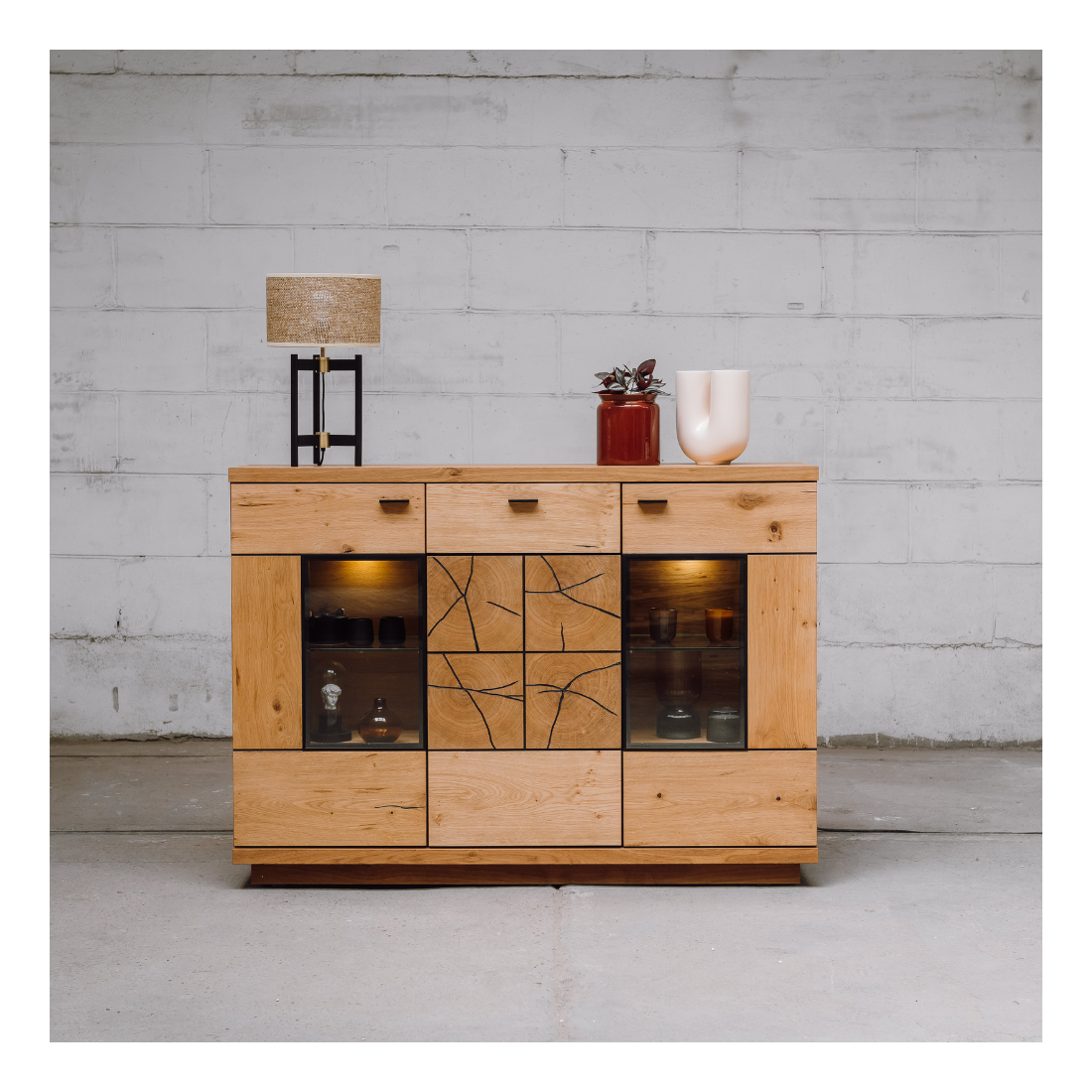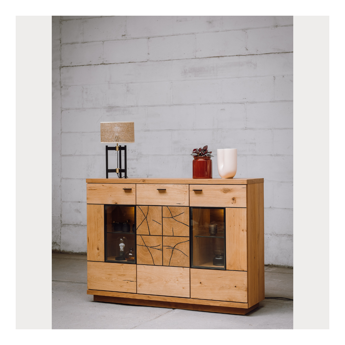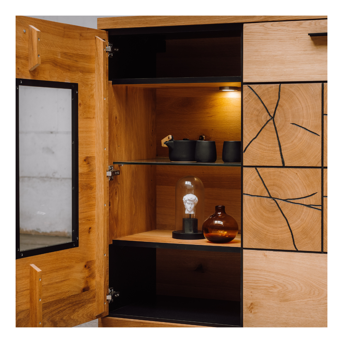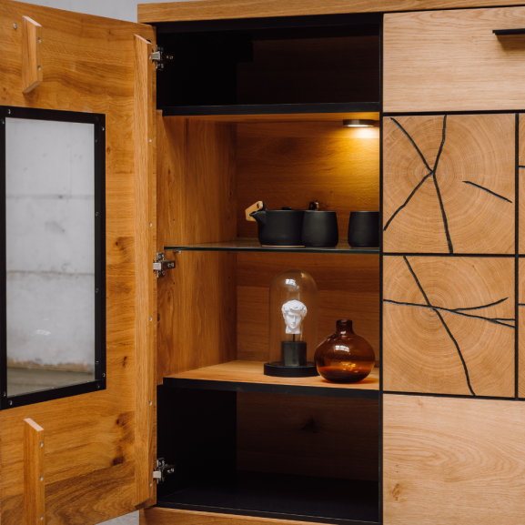 Fronturile din MDF cu furnir masiv de înaltă calitate subliniază atenția la detalii și calitatea estetică a acestei comode bar. Sertarul și cele 3 uși, cu funcție push-to-open și manere metalice, aduc un element practic și modern la utilizarea piesei de mobilier.