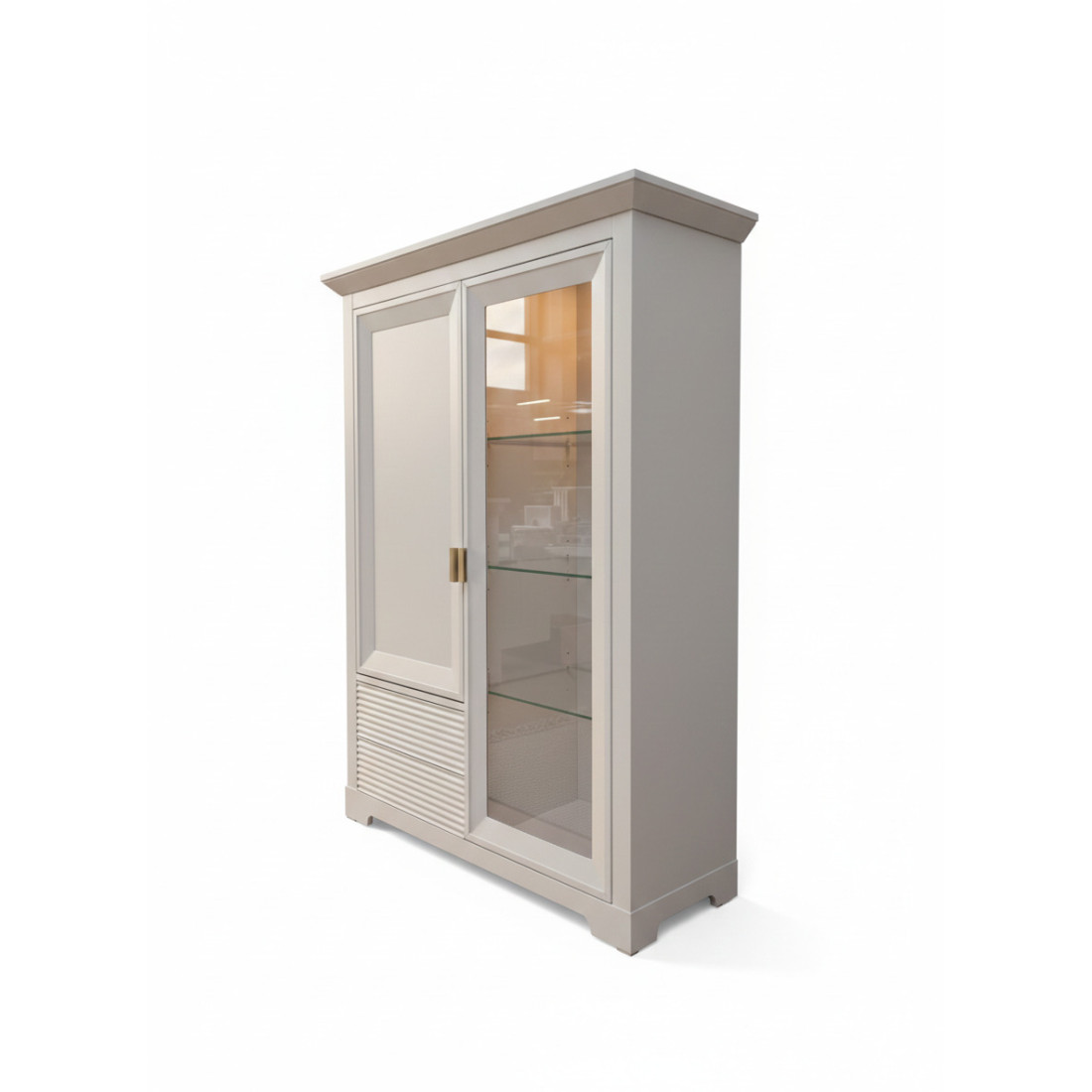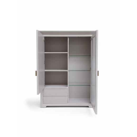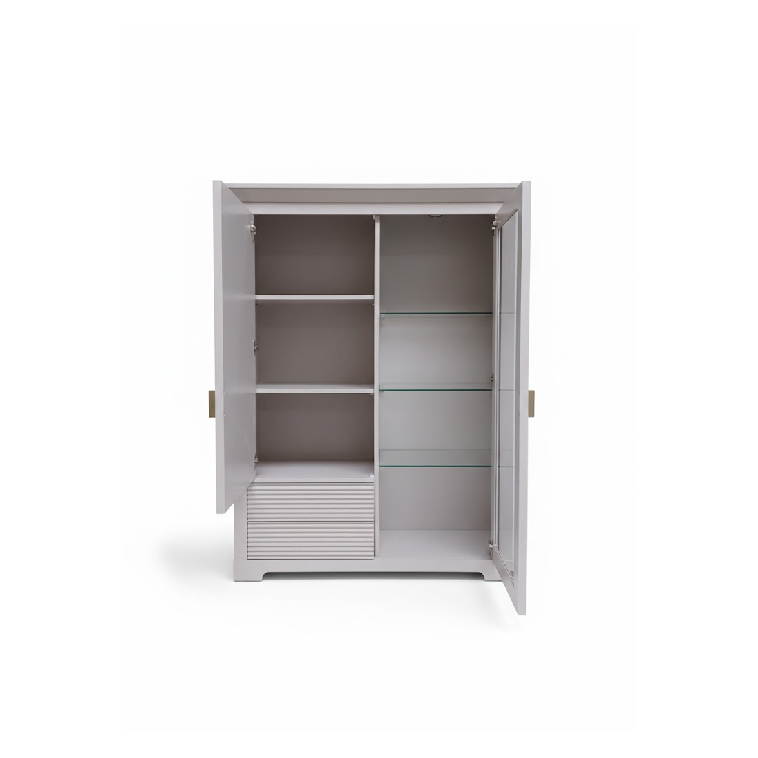 Pe partea dreapta are trei polite din sticla acoperite cu o usa din sticla, iar pe partea stanga cele doua sertare cu sistemul de deschidere/inchidere tip Push To Open sunt ideale pentru organizarea si accesul rapid catre produse de dimensiuni reduse. Cele trei rafturi acoperite cu usa plina sunt potrivite pentru pastrarea mereu la indemana a obiectelor necesare in spatiul unde doriti sa o amplasati.