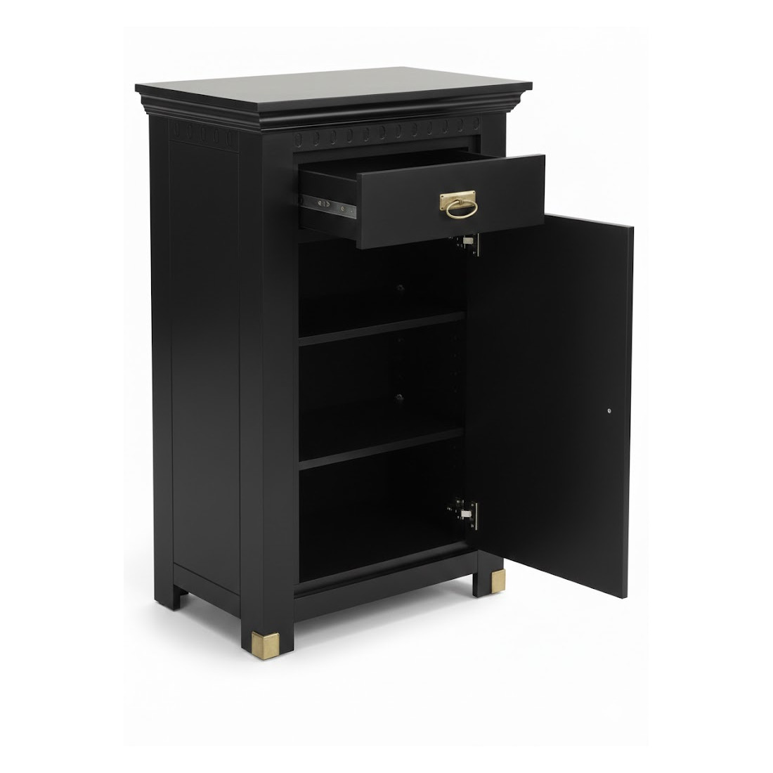 Comoda dispune de 1 sertar spațios pentru obiecte mici și 1 ușă cu rafturi interioare, ideale pentru depozitarea articolelor de uz zilnic, lenjeriei sau documentelor. Accentele metalice aurii la mânere și la baza picioarelor oferă un contrast sofisticat și un aspect premium.