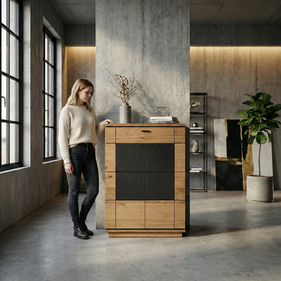 Impresionează de la intrare cu Comoda de Hol Zenith, o piesă care îmbină funcționalitatea cu un design plin de caracter. Spre deosebire de restul casei, holul cere materiale rezistente și estetici puternice, iar acest model răspunde prin finisajul din furnir de stejar sălbatic (Wild Oak). Acesta prezintă o textură mai bogată și mai autentică, cu fibra lemnului dispusă orizontal și continuu, dintr-o singură bucată, pe toată fațada.