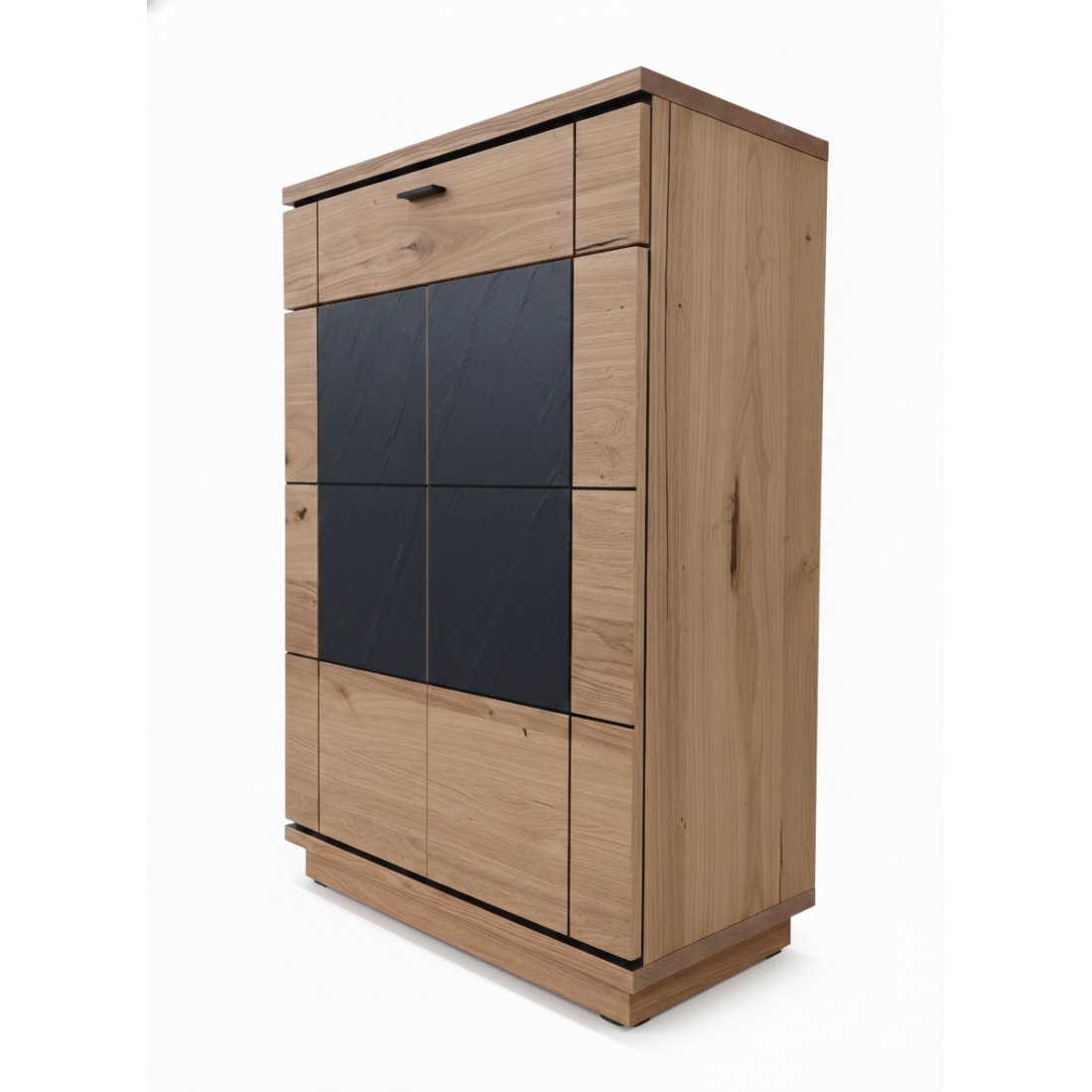 Eleganța rustică a stejarului este temperată de modernitatea inserțiilor centrale cu finisaj "Stone" (aspect granit), care dispun de o fazetare discretă pentru un plus de rafinament. Organizarea este simplă și eficientă:
