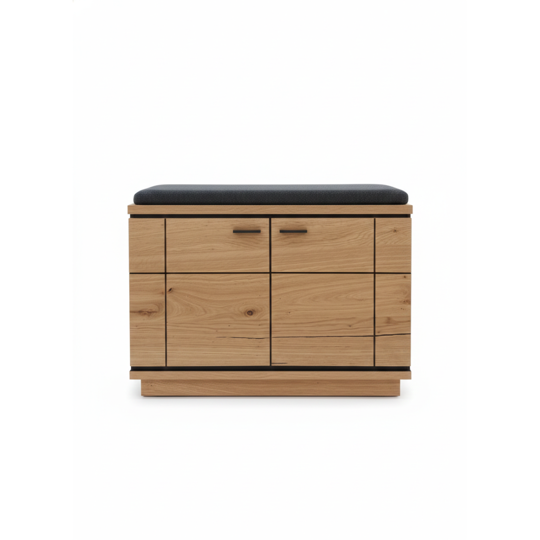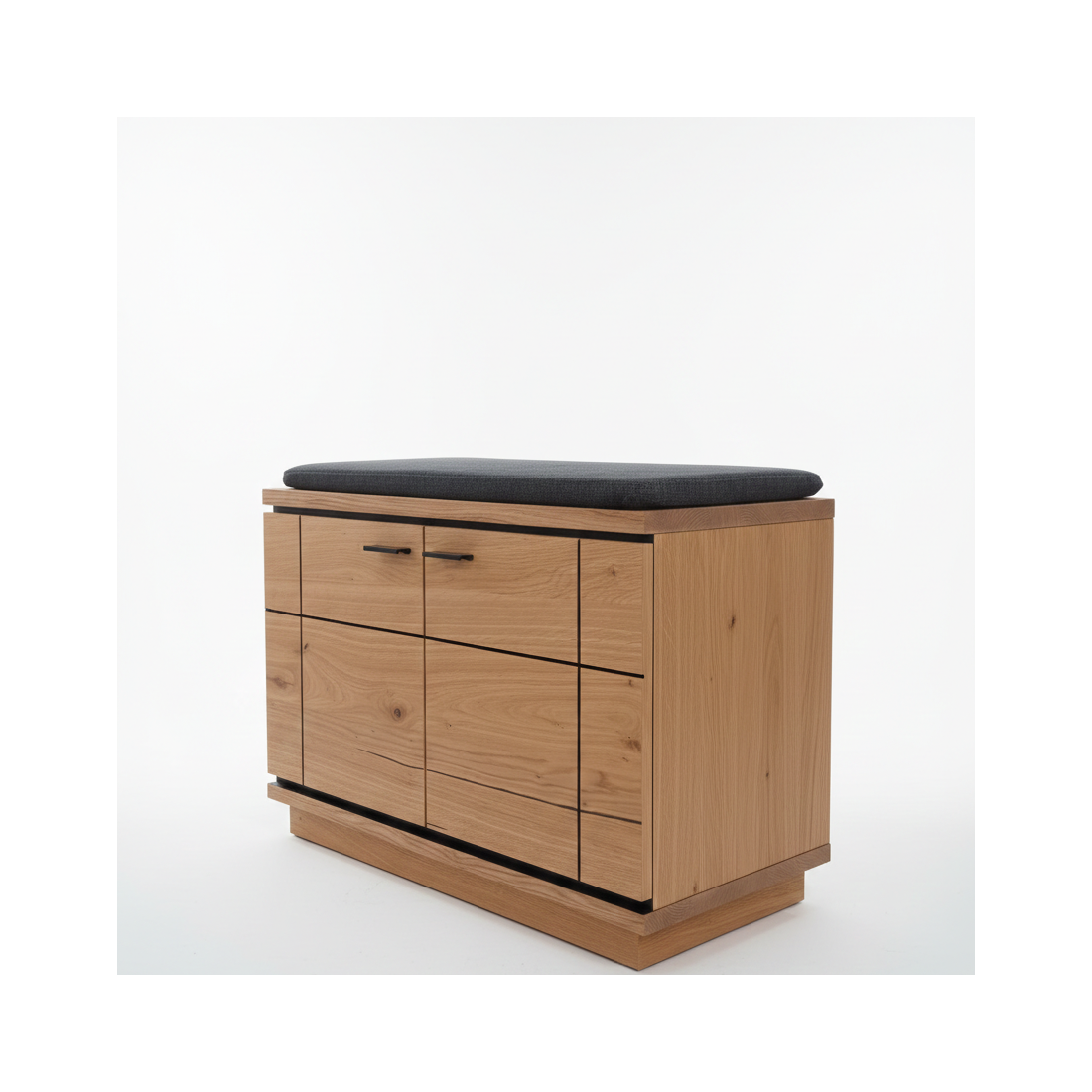 Combinația dintre corpul vopsit în gri mat și blatul superior din furnir natural de stejar creează un contrast cald și primitor. Compartimentarea este gândită pentru nevoile unei familii întregi: