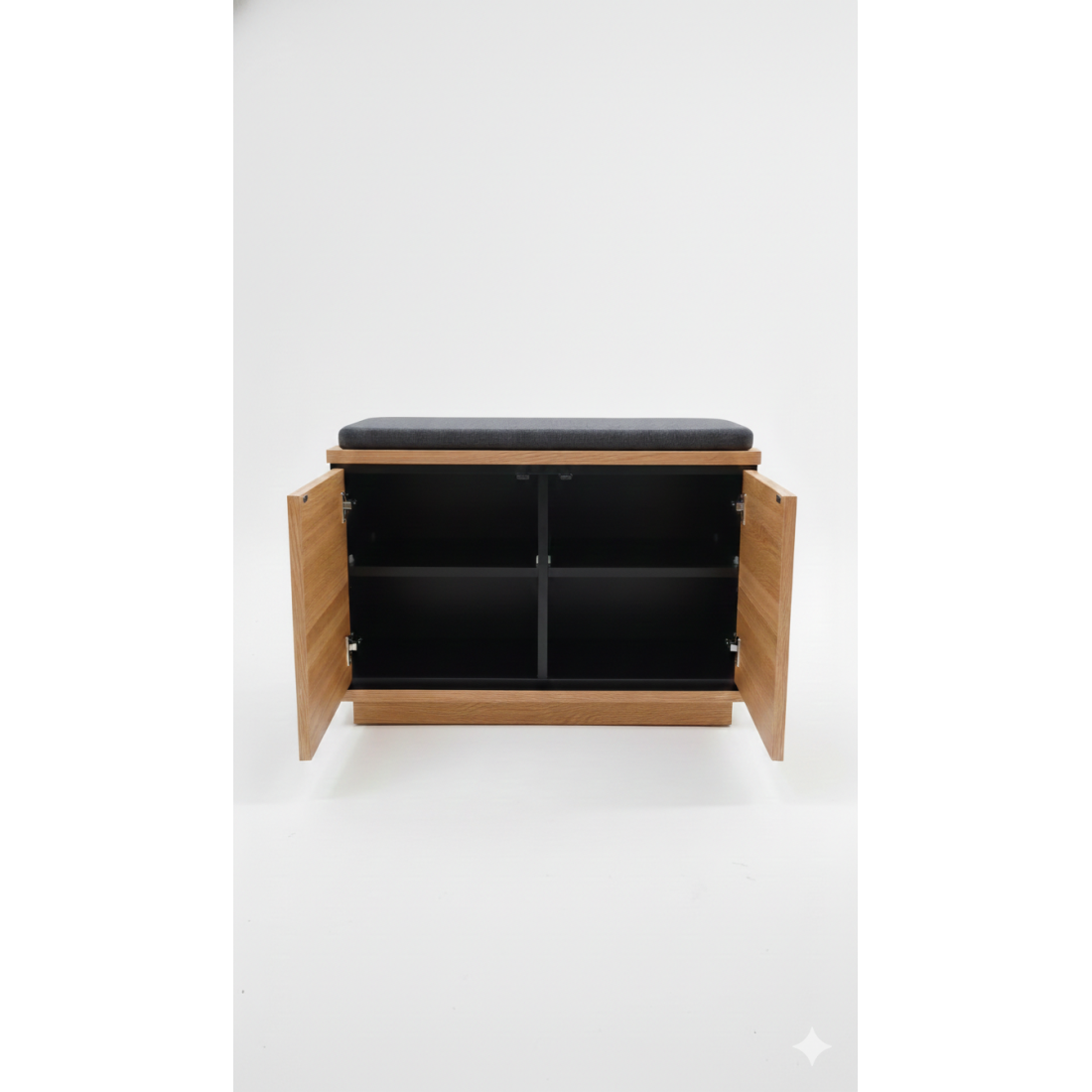 Zonele laterale: Cele două uși înalte ascund rafturi spațioase, ideale pentru cizme, ghete sau cutii voluminoase.