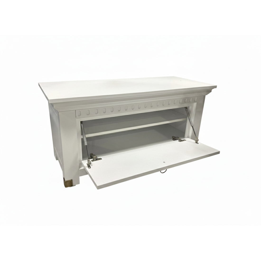 Datorită construcției solide și compartimentului spațios, comoda oferă suficient loc pentru depozitarea pantofilor și accesoriilor, păstrând ordinea într-un mod estetic. Sistemul de deschidere rabatabil este practic și elegant, iar accentele metalice aurii oferă un plus de stil și rafinament.
