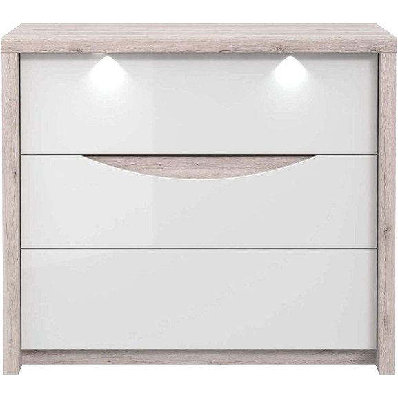 Comoda Sentire în nuanța stejar nisipiu și alb lucios cu 3 sertare este o piesă de mobilier modernă și funcțională, concepută pentru a oferi spațiu de depozitare și un aspect elegant în orice cameră a casei tale. Această comodă combină designul atractiv cu caracteristici inteligente, precum sertare cu auto-închidere și iluminare LED inclusă.