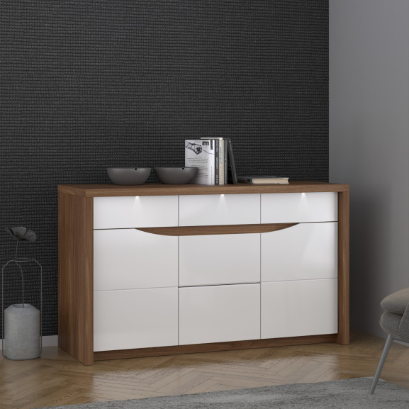 Adăugați o notă de eleganță și funcționalitate în locuința dumneavoastra cu comoda Sentozza, o piesă de mobilier excepțională cu 3 sertare și 2 uși. Realizată din lemn de stejar Sangallo și alb lucios, această comodă este dotată cu sertare cu auto-închidere tip push-open și accesorii de amortizare pentru un nivel superior de confort. Iluminarea LED inclusă evidențiază subtil frumusețea obiectelor așezate pe comodă, iar frontul cu elemente din MDF și folie lucioasă PVC adaugă un plus de stil și modernitate.