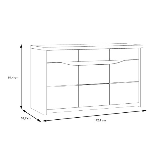 Comoda impresionează prin designul său contemporan, cu o combinație de texturi și culori. Lemnul de stejar Sangallo adaugă căldură și autenticitate, în timp ce finisajul alb lucios și frontul cu elemente din MDF și folie lucioasă PVC aduc un aer sofisticat și modern.