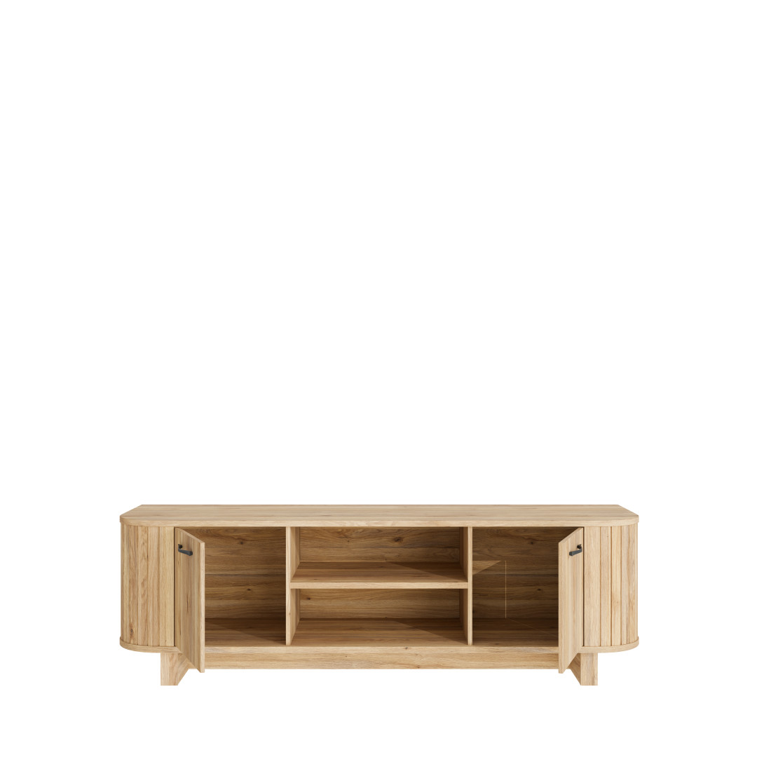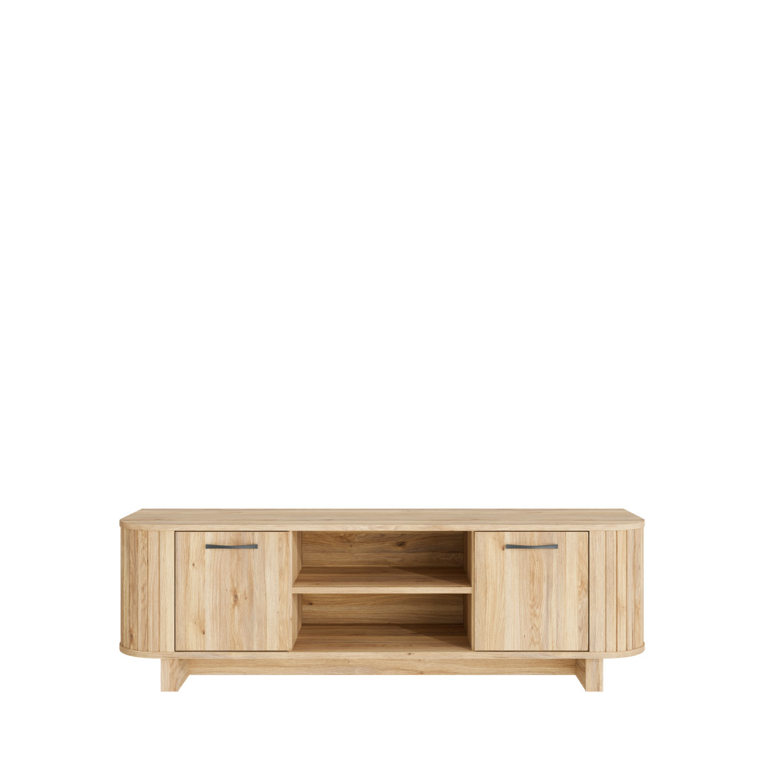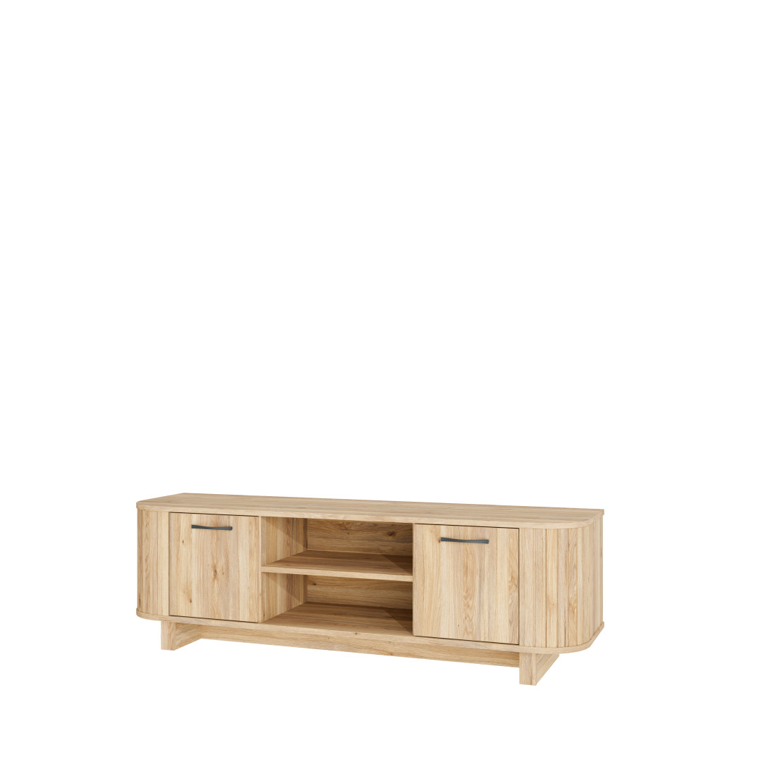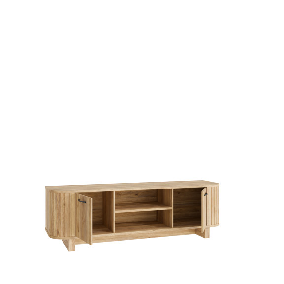 Comoda TV preia elementele definitorii ale colecției Forest: extremitățile rotunjite cu textură verticală ce conferă un aspect vizual moale și natural. Finisajul de stejar, bogat în detalii ce imită fibra lemnului, este pus în valoare de mânerele metalice negre, care aduc o notă contemporană și asigură o prindere ergonomică.
