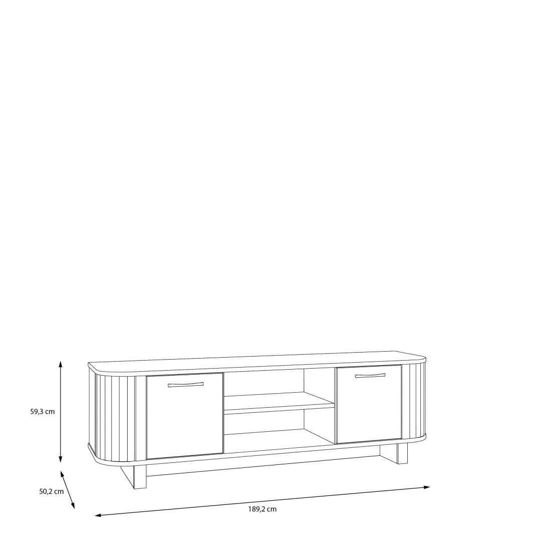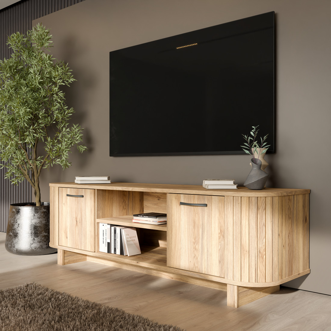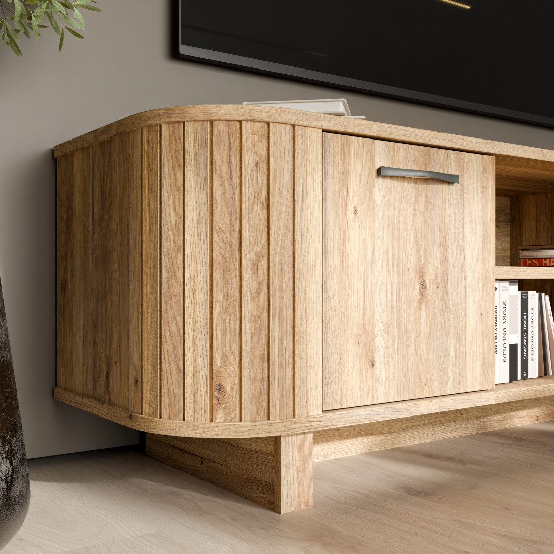 Comoda TV preia elementele definitorii ale colecției Forest: extremitățile rotunjite cu textură verticală ce conferă un aspect vizual moale și natural. Finisajul de stejar, bogat în detalii ce imită fibra lemnului, este pus în valoare de mânerele metalice negre, care aduc o notă contemporană și asigură o prindere ergonomică.
