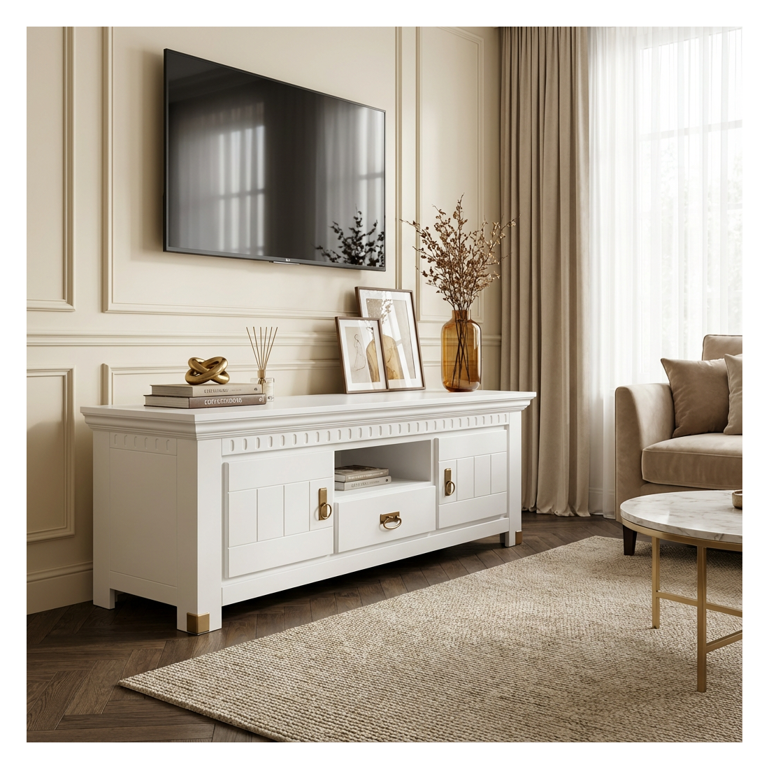 Un televizor modern este alegerea principală pentru relaxare în orice sufragerie, iar o comodă TV cu elegante elemente de feronerie, aurii, și detalii de design ca sculptate cu măiestrie vor transforma orice moment petrecut pe canapea în pură bucurie.