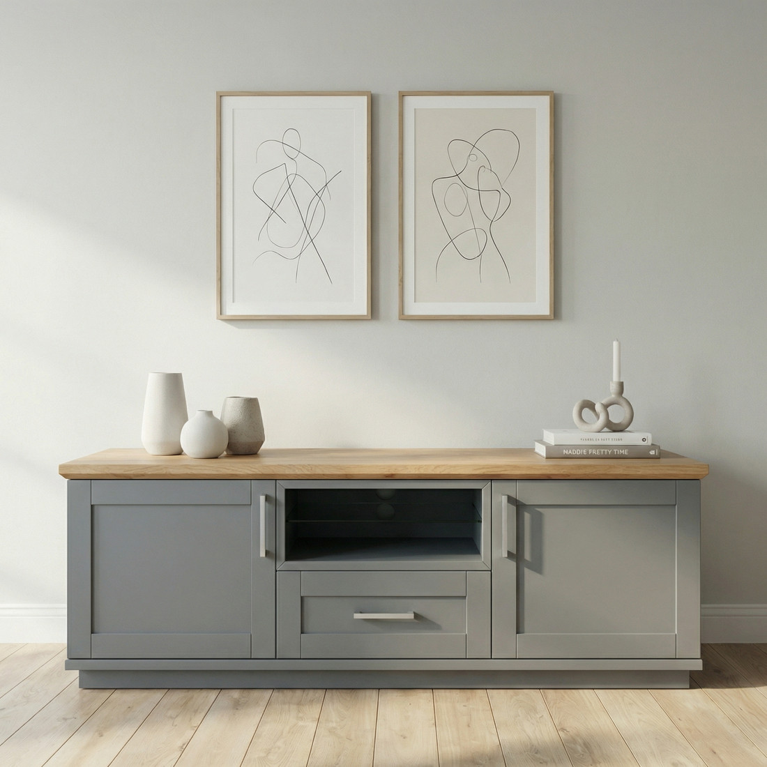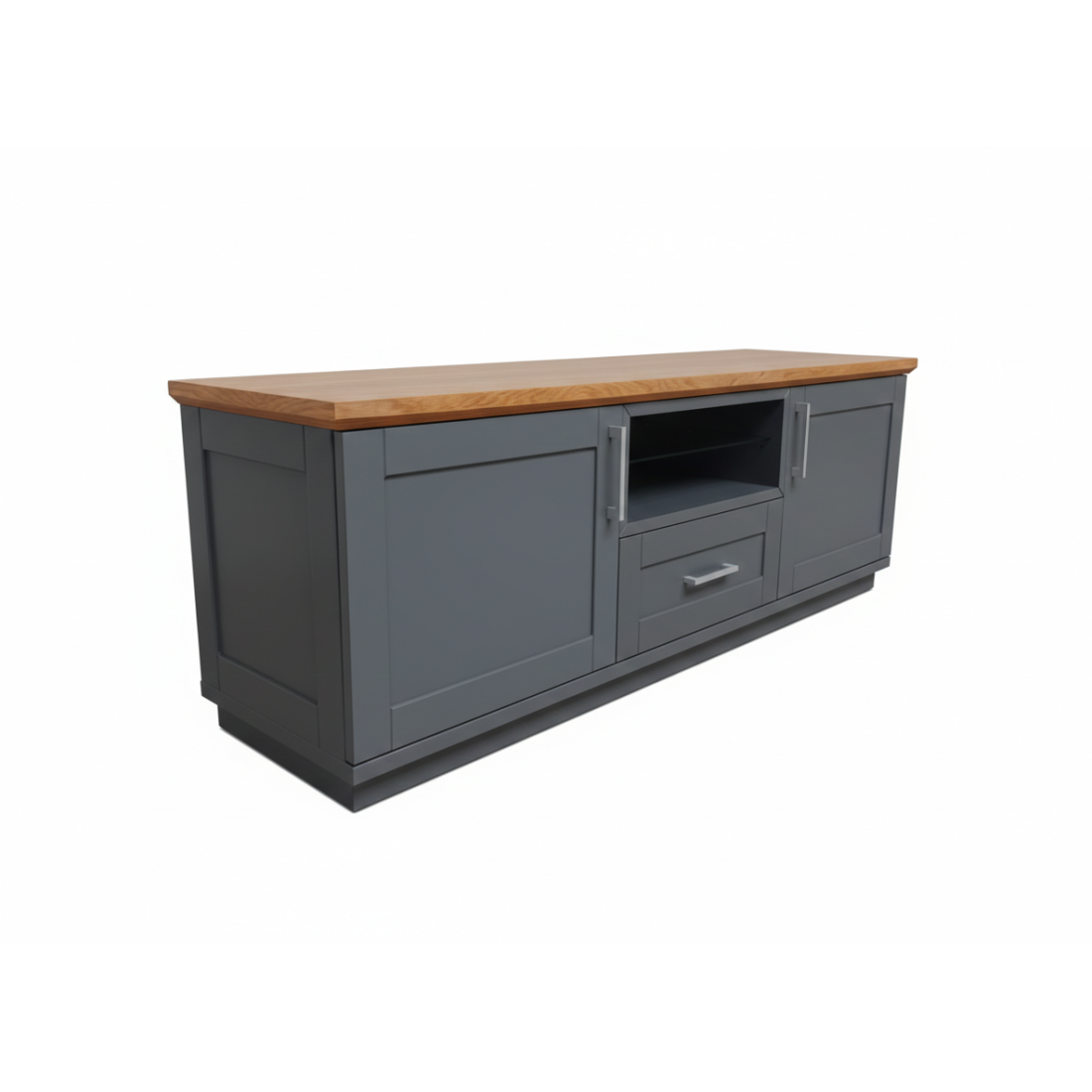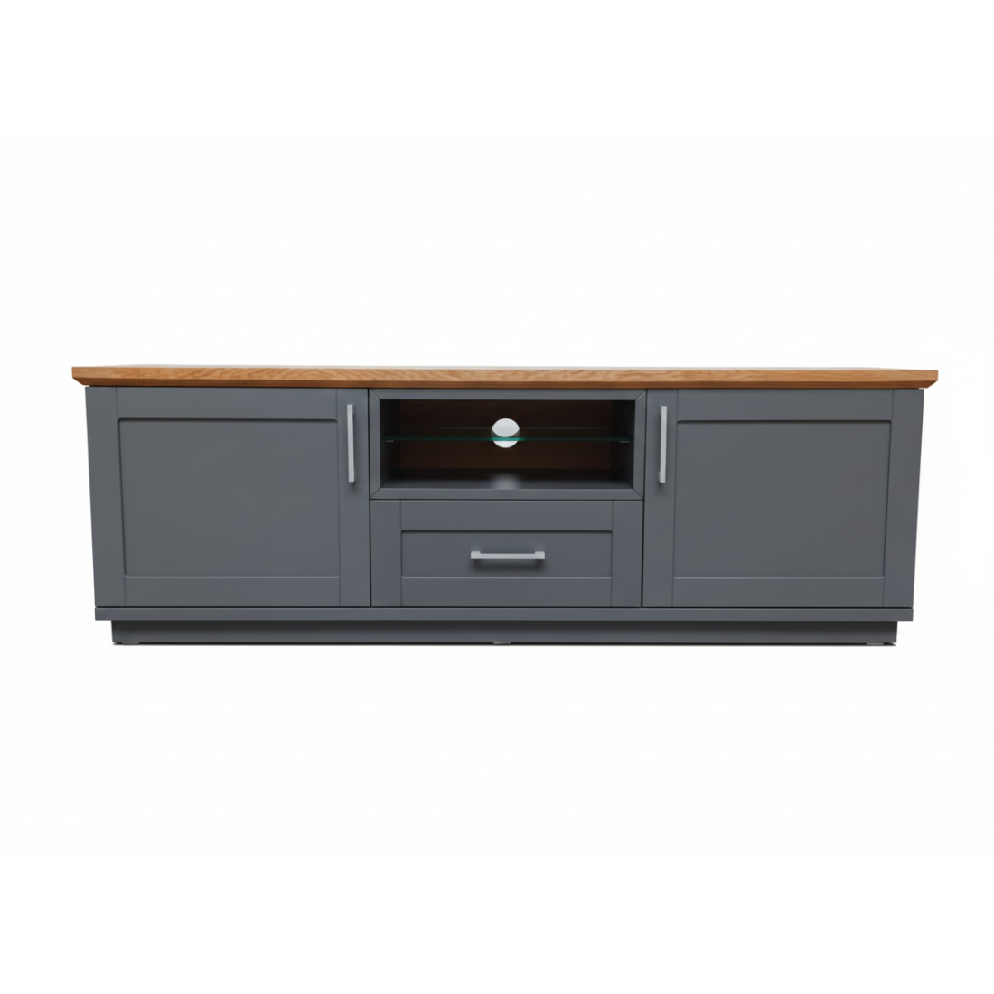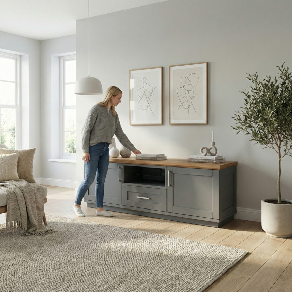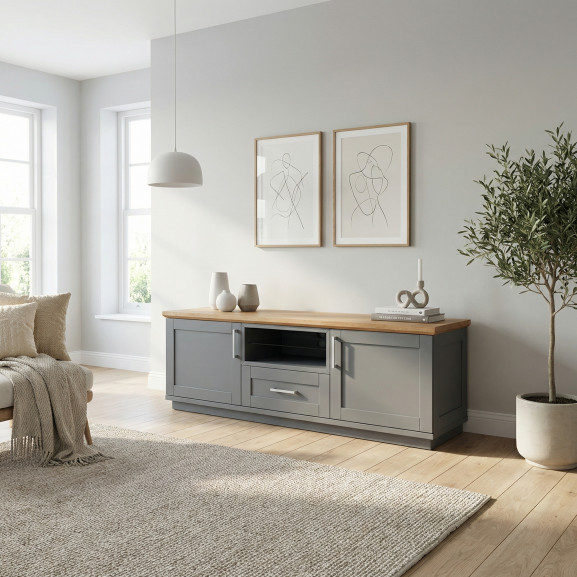 Transformă-ți livingul într-un spațiu primitor și organizat cu această comodă TV elegantă. Finisajul gri mat, realizat prin vopsire, oferă o notă de prospețime și luminozitate, în timp ce blatul superior din furnir natural de stejar susține perfect televizorul, aducând un contrast cald și natural în decorul casei tale.