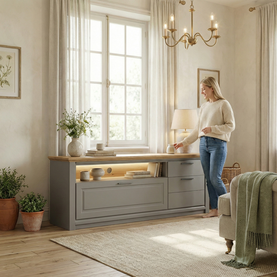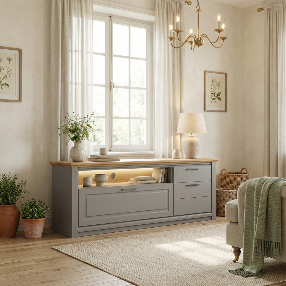 Designul îmbină estetica modernă cu detalii clasice rafinate: corpul finisat în Gri Grafit Mat (Graphit Matt) emană eleganță, în timp ce blatul superior din furnir natural de stejar aduce o notă de căldură și contrast. Detaliul care atrage privirea este frontul casetat (ușa din stânga cu ramă decorativă), care oferă adâncime și caracter mobilierului.