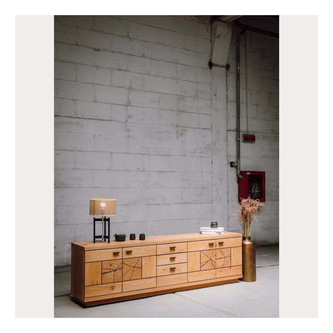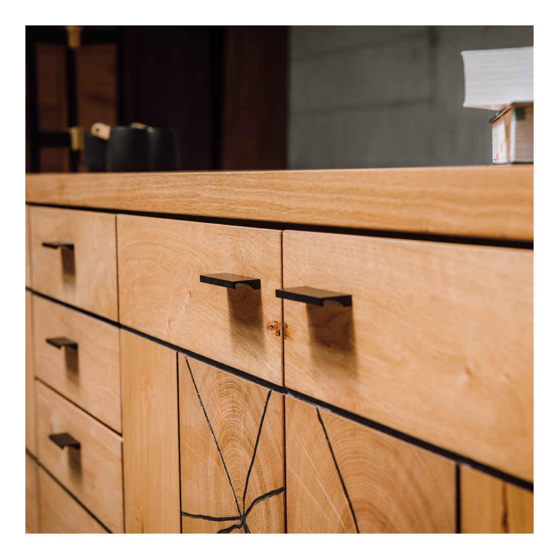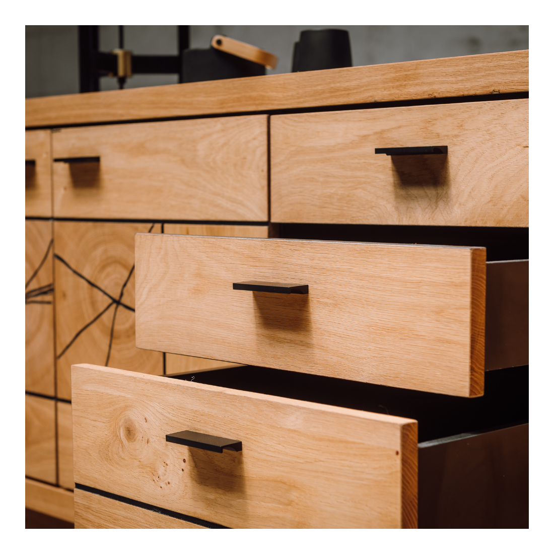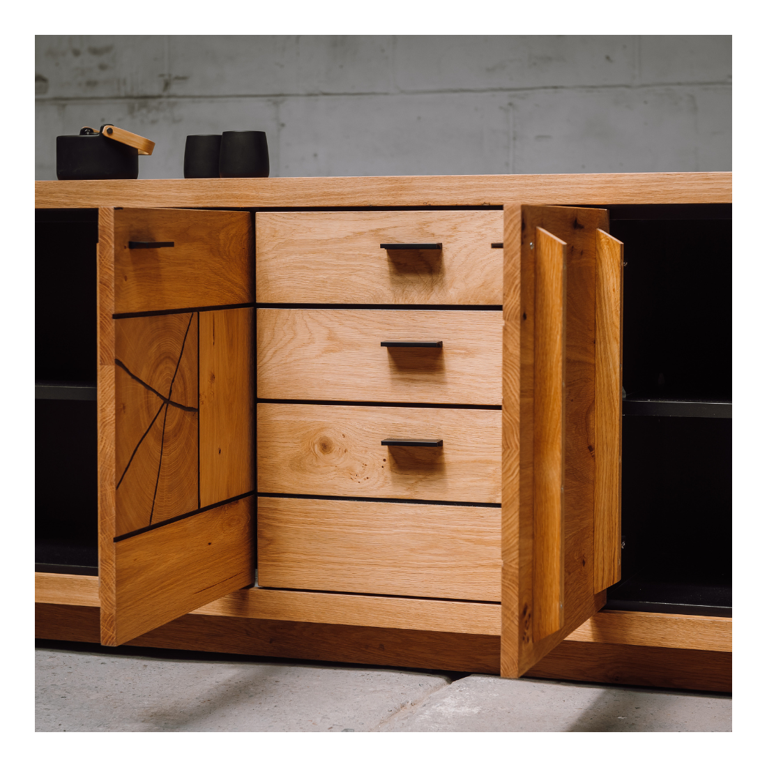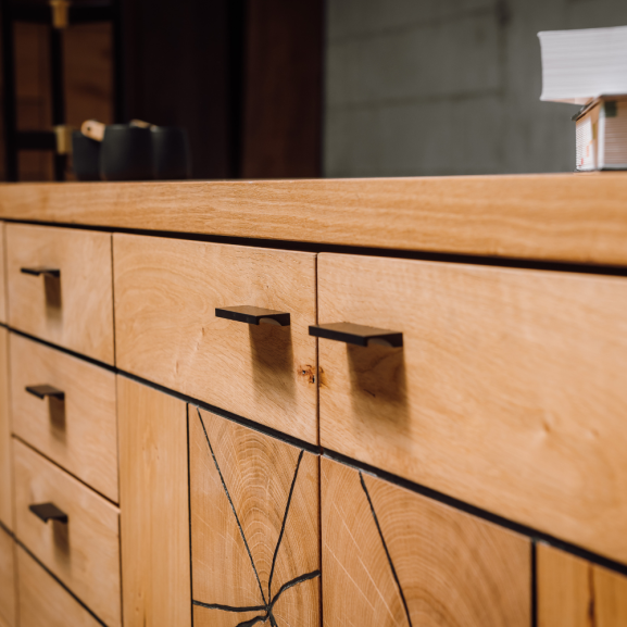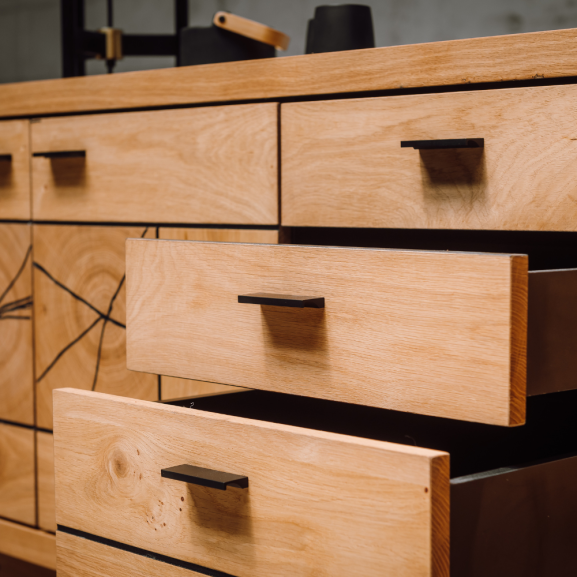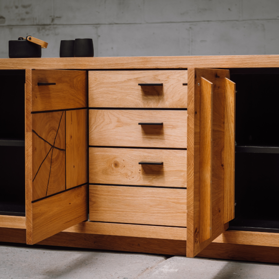 Stejarul sălbatic și manerele metalice negre se îmbină armonios pentru a conferi comodei un stil unic. Această piesă de mobilier nu doar oferă funcționalitate excelentă, ci și adaugă o notă de rafinament și personalitate în orice încăpere.