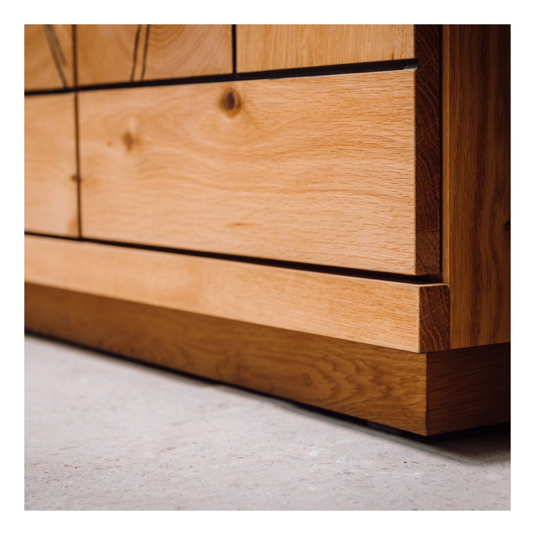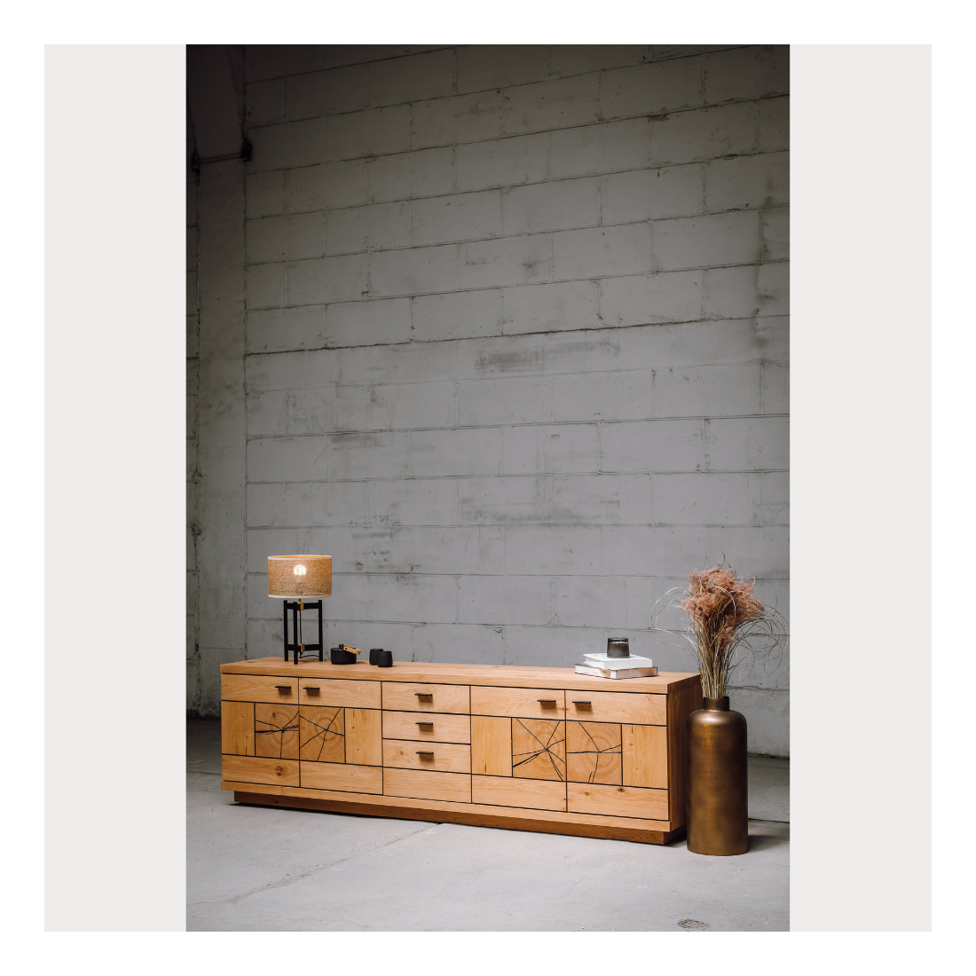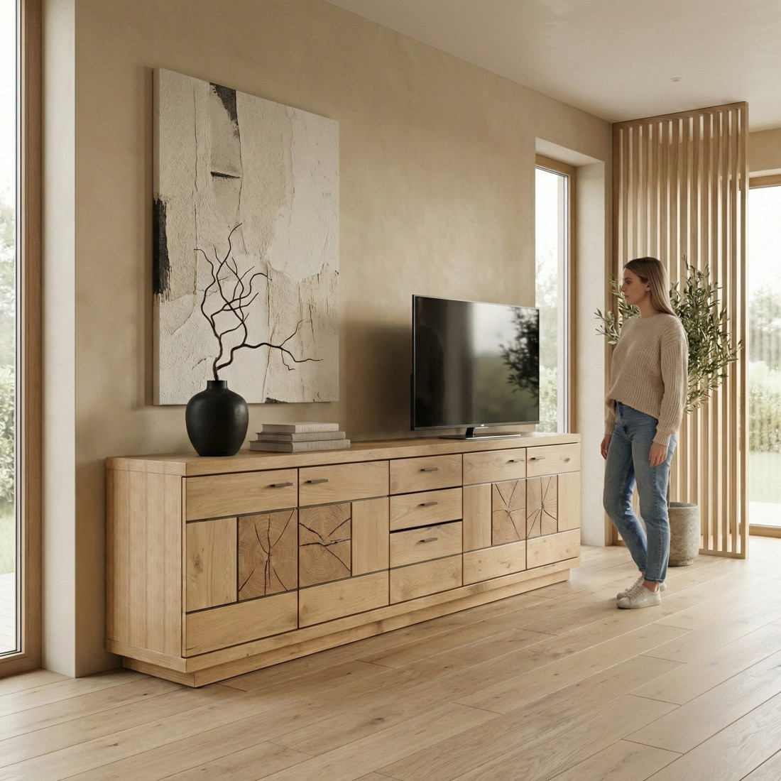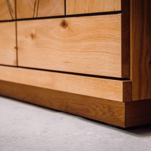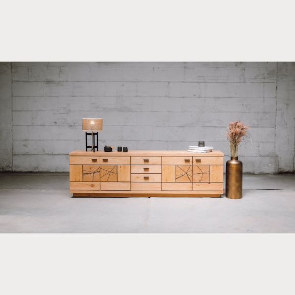 Realizată din plăci aglomerate din lemn și front MDF cu aplicații de furnir din lemn masiv, comoda garantează o durabilitate remarcabilă și un aspect luxos. Materialele de înaltă calitate sunt atent selectate pentru a oferi o experiență de utilizare pe termen lung.