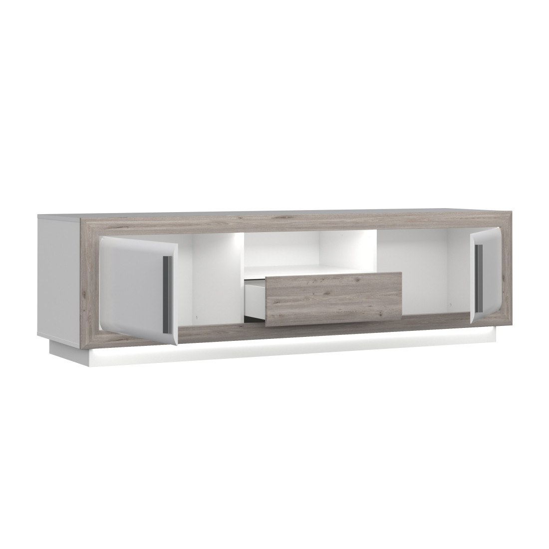 Mânerele din plastic cu aspect din aluminiu adaugă un strop de eleganță și asigură o priză confortabilă atunci când deschizi ușile și sertarul. Această comodă TV este nu doar un suport pentru echipamentele tale electronice, ci și o piesă de design de excepție care completează decorul camerei.