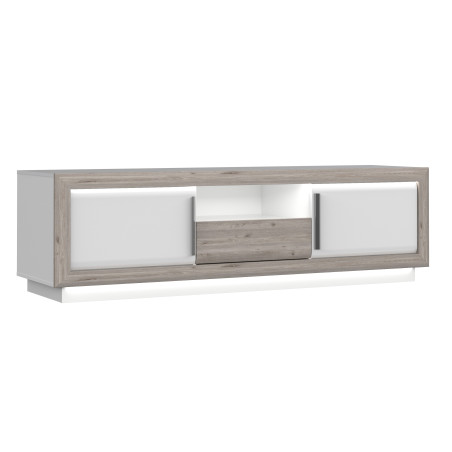 Comoda TV este dotată cu LED-uri incluse, care permit crearea unei atmosfere deosebite în timpul vizionării. Sertarul este prevăzut cu mecanism de închidere automată și accesorii de amortizare pentru a asigura o experiență de utilizare lină și fără zgomot.