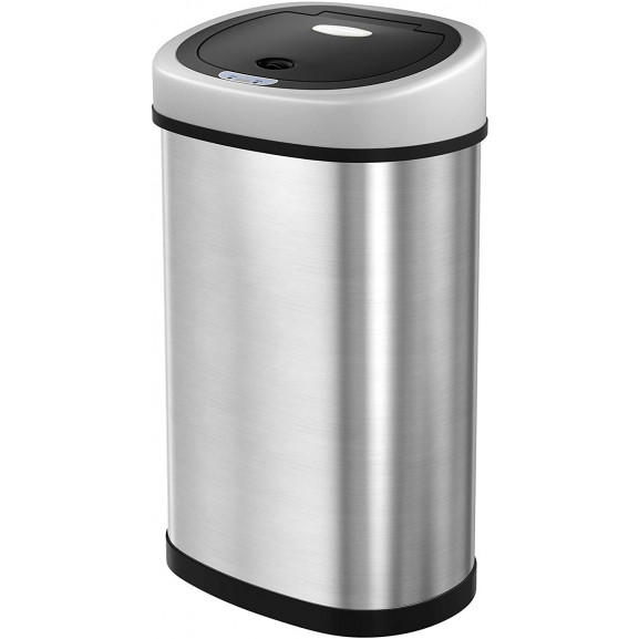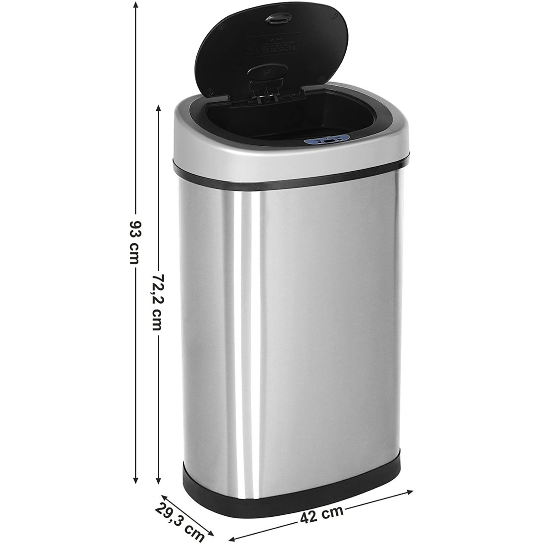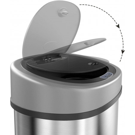 Dispozitiv practic Smart-Home - fluturati mana aproape de senzorul infraroșu pentru a deschide.Acest coș de senzori se va închide automat după 5 secunde.Țineți-vă mâinile în limitele de detectare sau apăsați „DESCHIS” pentru a menține capacul coșului de gunoi rămâne deschis vertical.Creează o casă ordonată avand o capacitate generoasă de 50 L (pentru sacul de gunoi de 50-60 L) asigurată de un cilindru eliptic compac. Acest cos este  alimentat de baterii de 3 C (care nu sunt incluse).Capacul este construit din plastic ecologic, bine sigilat pentru a păstra mirosurile.Cosul este  ușor de curățat -fiind construit din oțel inoxidabil  pentru găleată exterioară, făcând acest coș cu  senzori rezistent la amprente și ușor de curățat. Petele pot fi îndepărtate cu o cârpă umedă iar  janta de protecție din plastic previne deteriorarea podelei.Apăsați inelul pentru fixarea sacului de gunoi. Sacul de gunoi este invizibil din exterior.