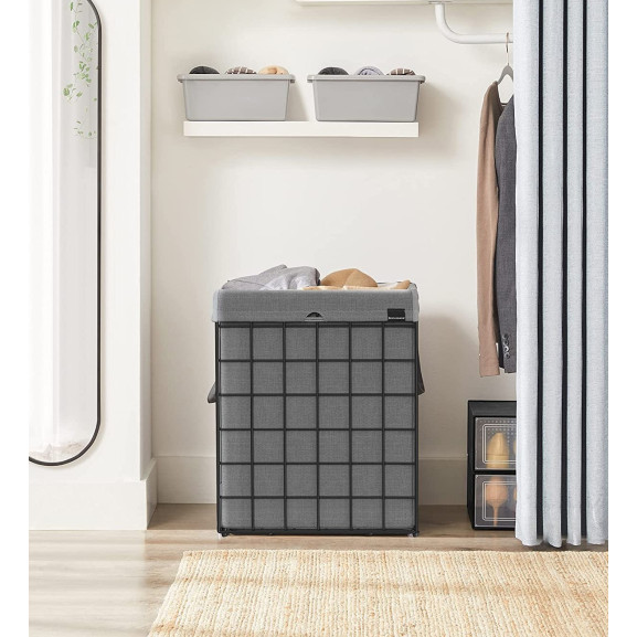 Atașată la coș cu elemente de fixare cu cârlig și buclă, geanta este ușor de îndepărtat. Mânerele vă permit să vă transportați cu ușurință rufele din dormitor în spălătorie sau baie, fără a fi nevoie să transportați întregul coș de rufe.