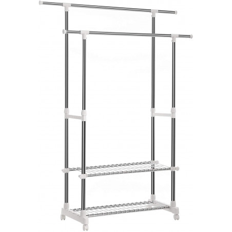 Cu un design simplu si inovativ, se potriveste peste tot, in living, dormitor etc, fiind potrivit pentru depozitarea hainelor, gentior sau a prosopelor. Prezinta o asamblare usoara. Bara de otel inoxidabil asigura durabilitatea si rezistenta. Este conceput pe 2 niveluri de depozitare pentru o mai buna functionalitate si pentru a economisi spatiu.